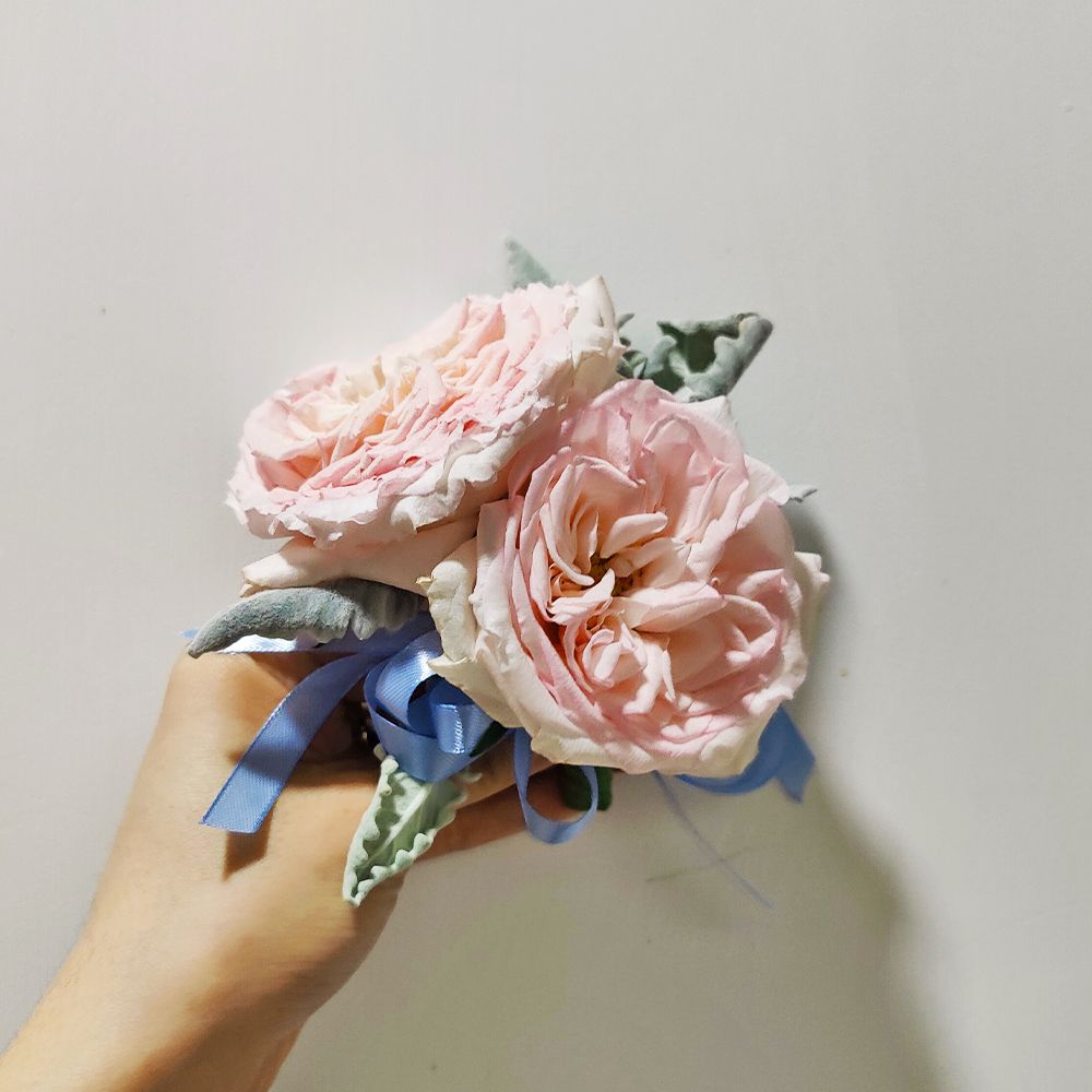 婚禮,是兩顆心正式交匯的童話起點。這款結婚花球以 9+1 朵象徵「十全十美」的嬌豔粉玫瑰為主調,輕柔地訴說著新娘的甜美與嬌羞。花藝師別出心裁地加入了市面罕見的藍星花,藍與粉的相遇宛如流星劃過粉色晚霞,唯美而夢幻;而帶有霜白雪質感的銀絨葉,更為整體造型披上了一層高級的仙氣薄紗。這不僅是一個完美的新娘花球,隨附的新郎襟花也同樣精緻,讓兩人在紅毯上互相輝映。