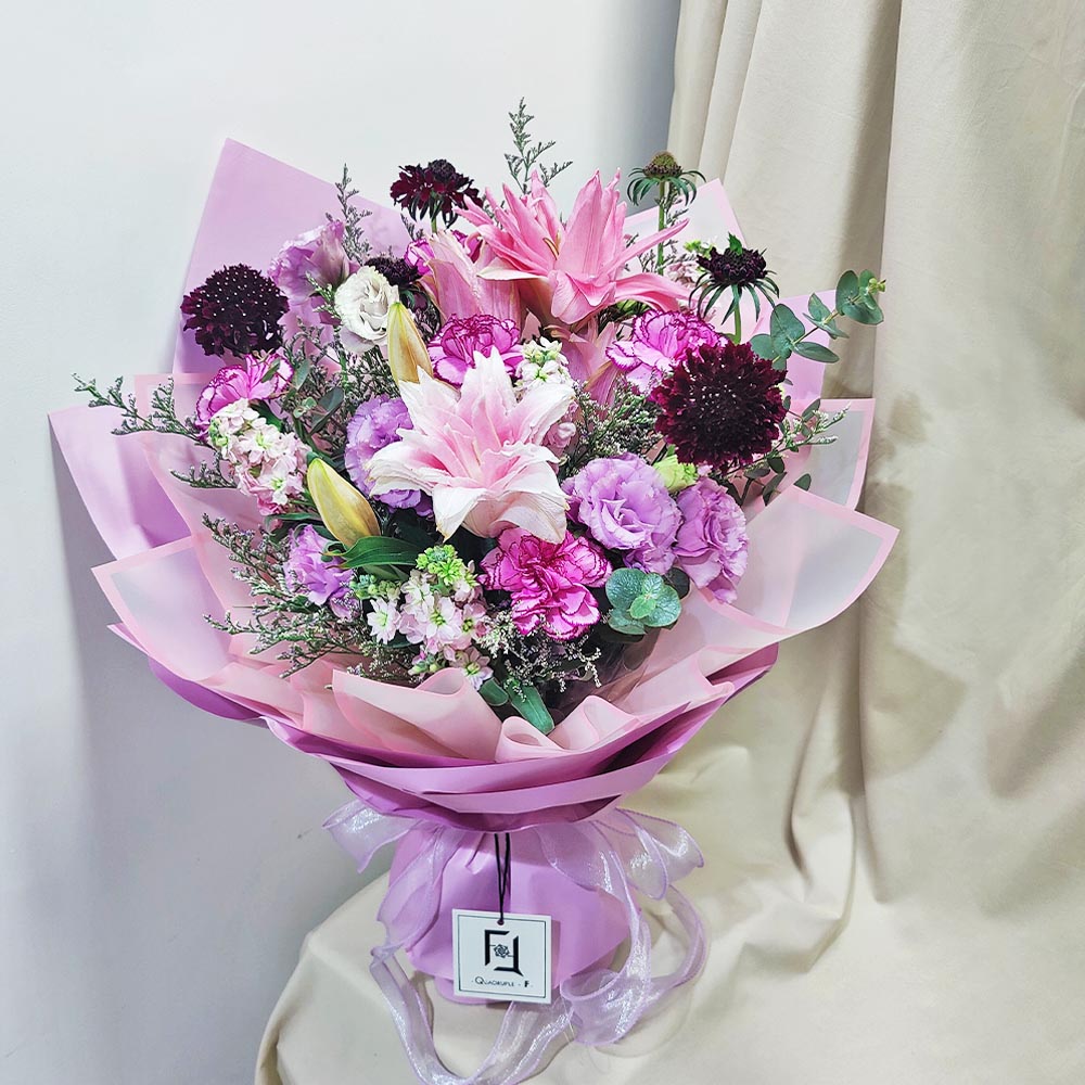 Youth may fade, but a mother’s elegance is eternal. “Purple Dream” aims to capture that timeless feminine charm, blending deep gratitude with ultimate romance. The visual center is a precious Roselily (double pink lily), its layered petals resembling a mother’s gentle hands brushing through the tracks of time. Paired with “Purple Fairy” carnations, the collision of purple and pink creates a breathtaking aura of dignity.