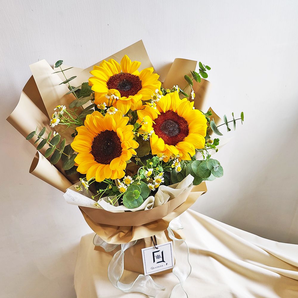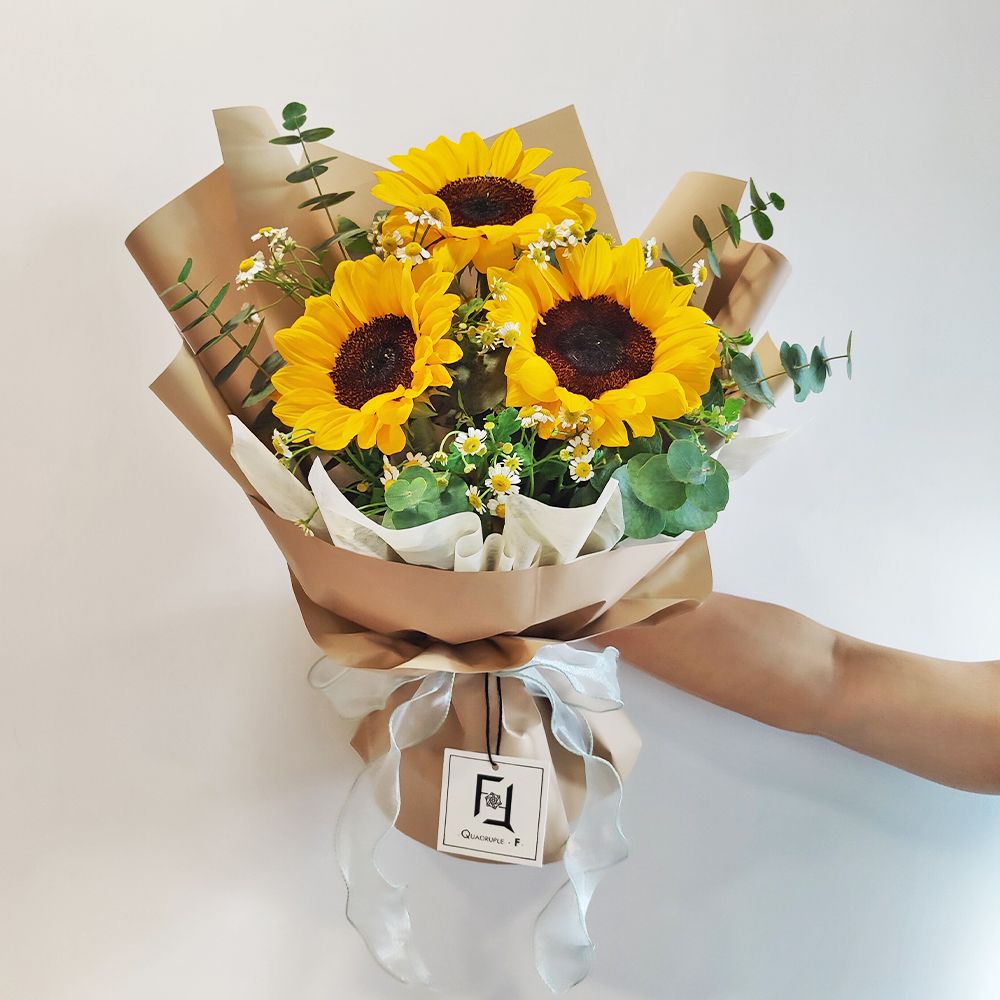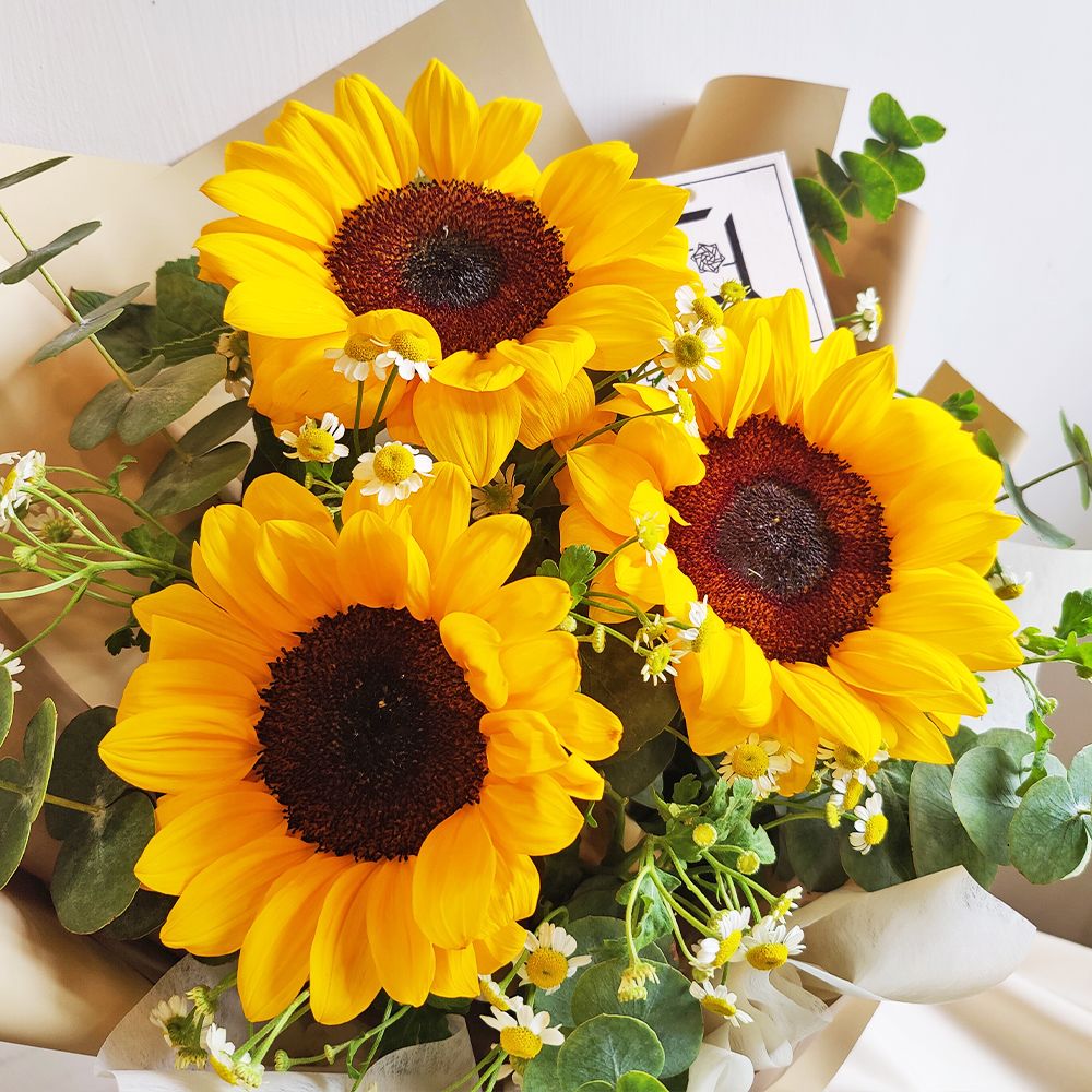 This bouquet is bursting with life and rustic charm. Sunflowers are arranged in a staggered, natural fashion, complemented by stars of Daisy to create a sincere, unadorned beauty. Large eucalyptus provides a beautiful grey-green backdrop, and its refreshing scent helps clear the mind and improve focus. This bouquet presents an atmosphere that is wild yet warm.