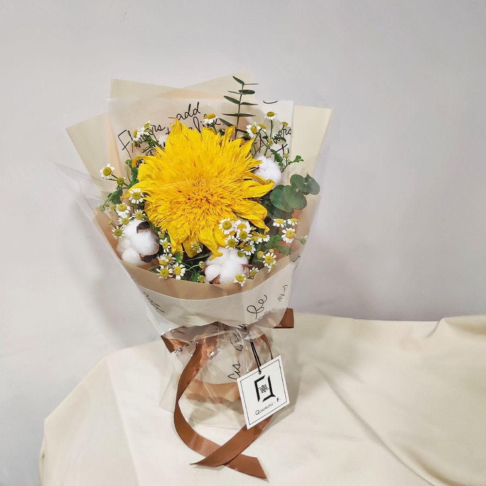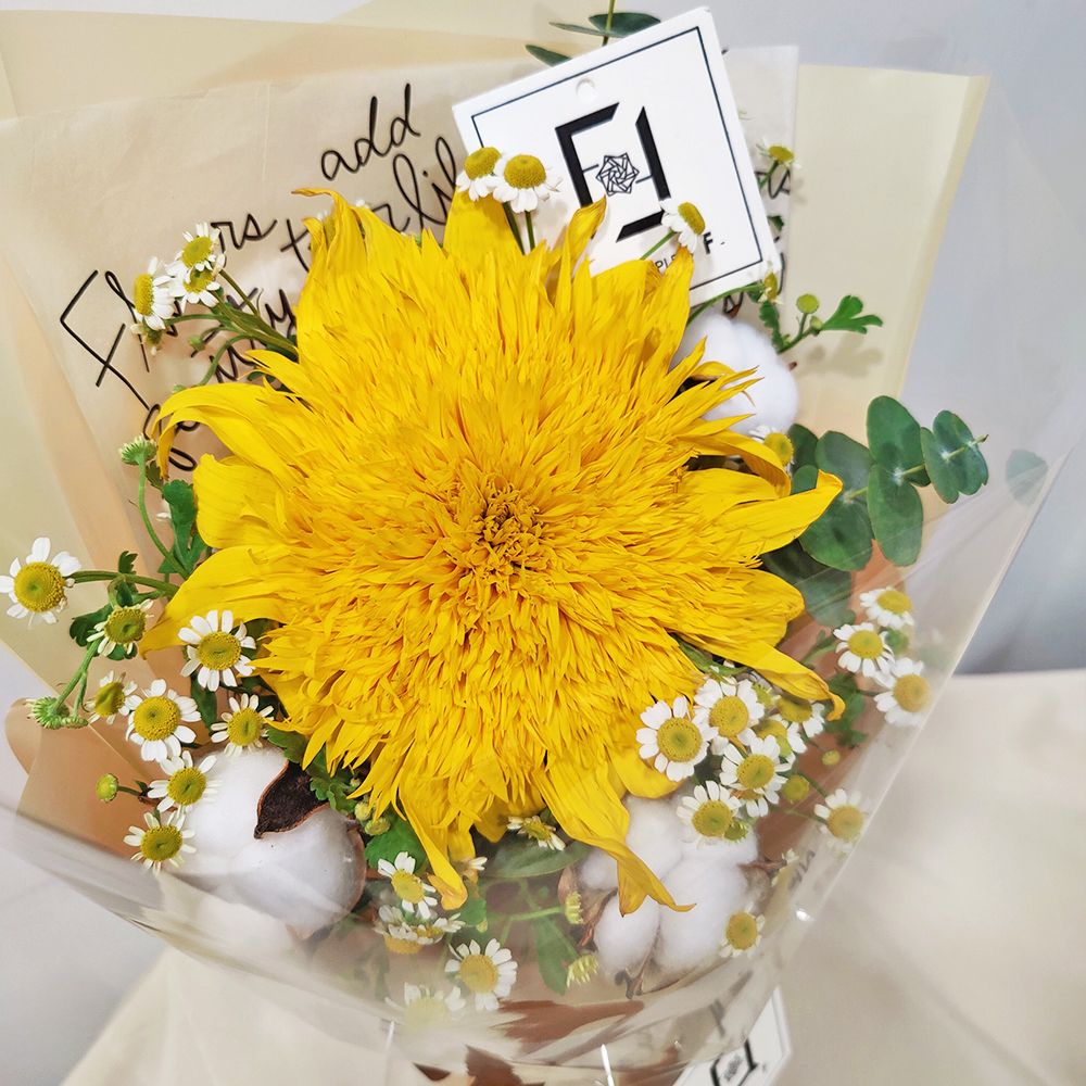 This is a highly healing minimalist bouquet. A double petal sunflower, rich in layers, is like a hug for the soul. The cotton accents add a cozy visual that invites a gentle touch. The abundance of chamomile ensures this “single-focus” bouquet does not look thin, but rather full of idyllic comfort. It is the best psychological solace for a best friend, colleague, or yourself.