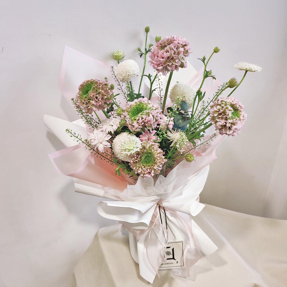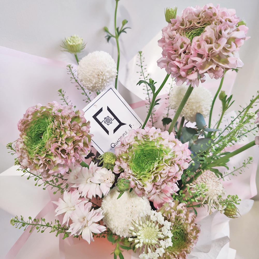 Every shining moment of celebration deserves a splash of brilliant color. We have specially selected the artistically vibrant “Koi Ranunculus” as the centerpiece, resembling spirited koi fish in a pond, bringing luck and vitality. Accented with white Pompons—symbols of “fulfillment”—along with delicate Trachelium, baby’s breath, and pink spray carnations, this bouquet is a visual feast of texture and movement. It perfectly embodies the effortless elegance of French floral design, making it an ideal gift for sophisticated women or professional promotions.