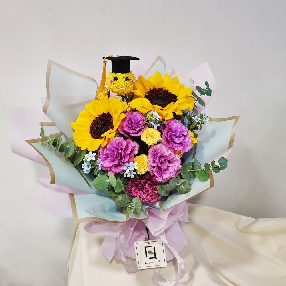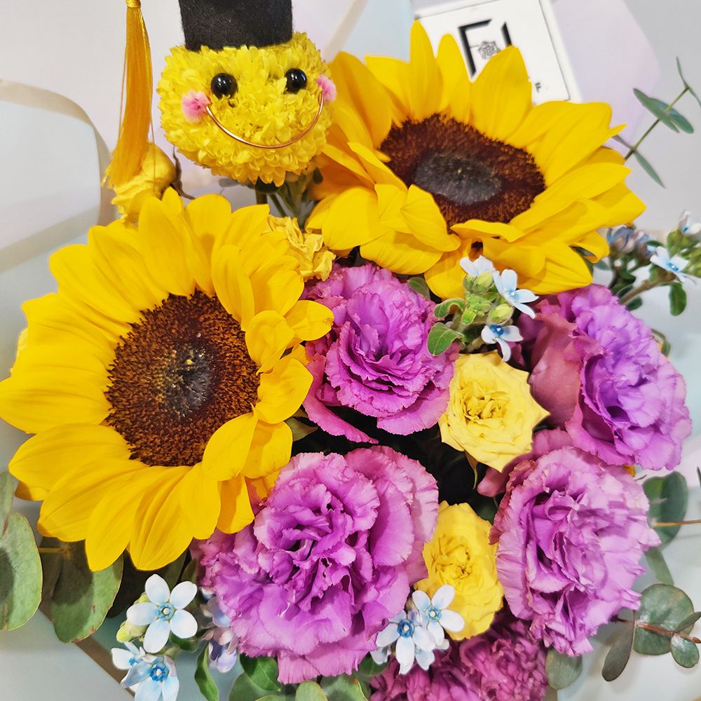 When passionate sunflowers meet elegant purple, it is a magnificent celebration for students. We keep the positive imagery of the sunflower and add expensive wavy purple lisianthus to make this graduation bouquet noble and unconventional. The yellow ping pong mum is like a fruit of hope, paired with an exquisite graduation cap to highlight the core meaning. Large eucalyptus enhances the layers, looking perfect from any angle.