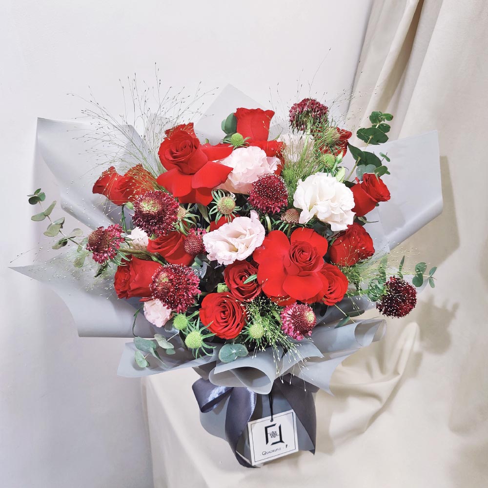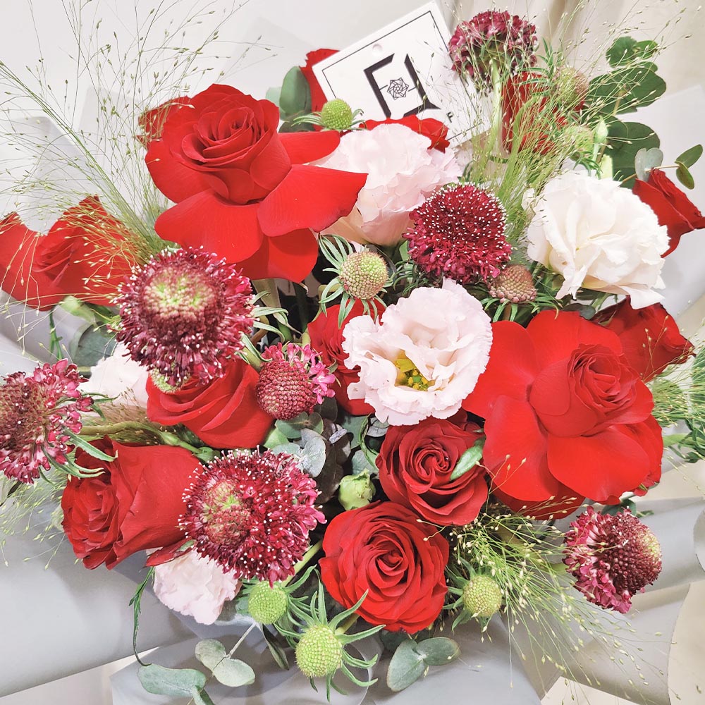 The unique velvety texture and smoke-like visual effect of the Fountain Grass act like a soft veil, cleverly wrapping the sharpness of the red roses to create a mysterious, deep romantic atmosphere. To enrich this visual feast, we’ve added Wavy Pink Lisianthus for a gentle transition, while the addition of red Scabiosa is a stroke of genius—its unique geometric form injects a strong sense of modern art into the bouquet.