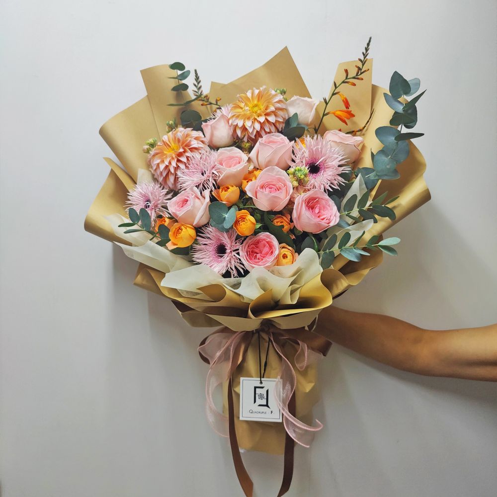 Indulge in timeless elegance with Peach Glow Serenade, a premium floral bouquet meticulously designed with pink roses, coral dahlias, pink spider gerberas, and Juice Balcony miniature roses. Each bloom is hand-selected to embody romance, sophistication, and warmth, while the khaki kraft paper wrapping adds a touch of natural refinement, elevating the bouquet into a poetic masterpiece.
