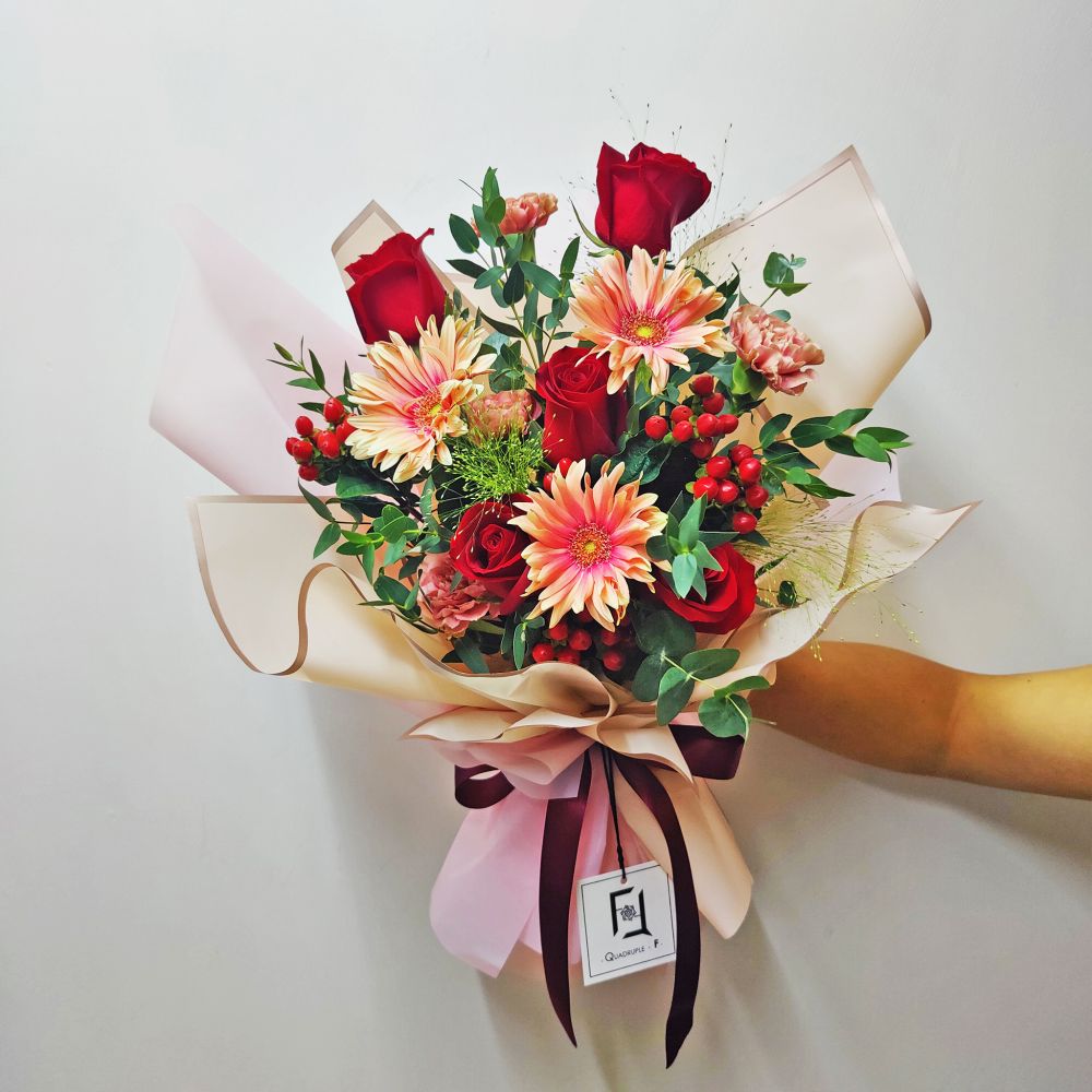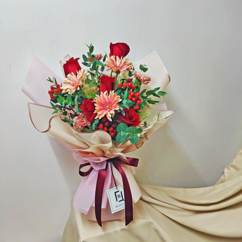 Passionate red rose bouquet paired with nude pink shades, this wonderful combination adds color to life and is a perfect blessing.