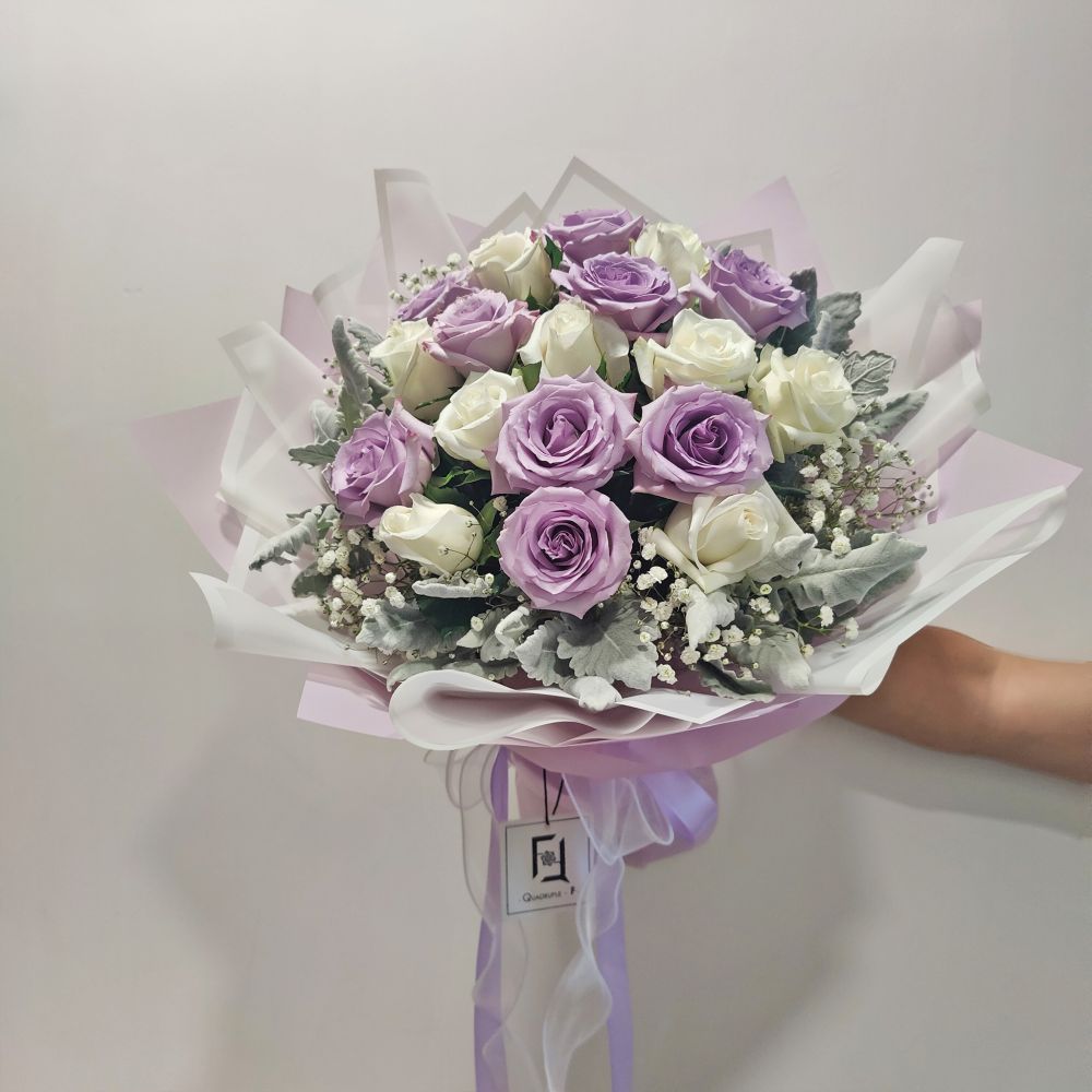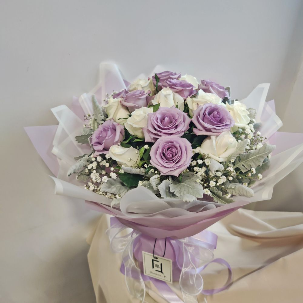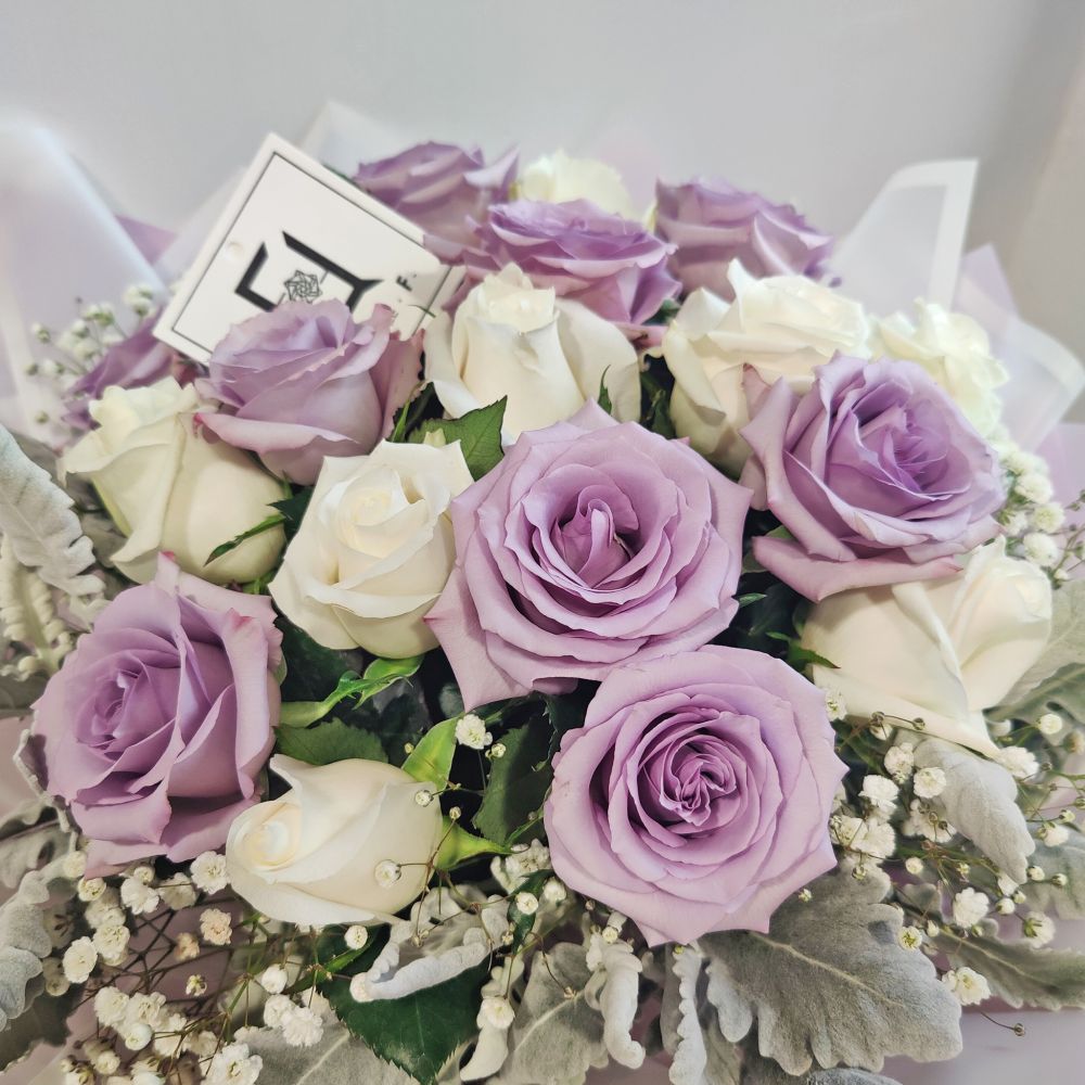 Some loves possess an irresistible mystery and grandeur. This bouquet features 18 purple and white roses expertly intertwined; purple symbolizes romance and nobility, while white represents purity. Together, they create a high-end texture that is truly breathtaking. Complemented by starry baby’s breath and unique Dusty Miller, the bouquet is voluminous and impactful—the ultimate choice for a wedding anniversary, a planned surprise confession, or a grand gala.