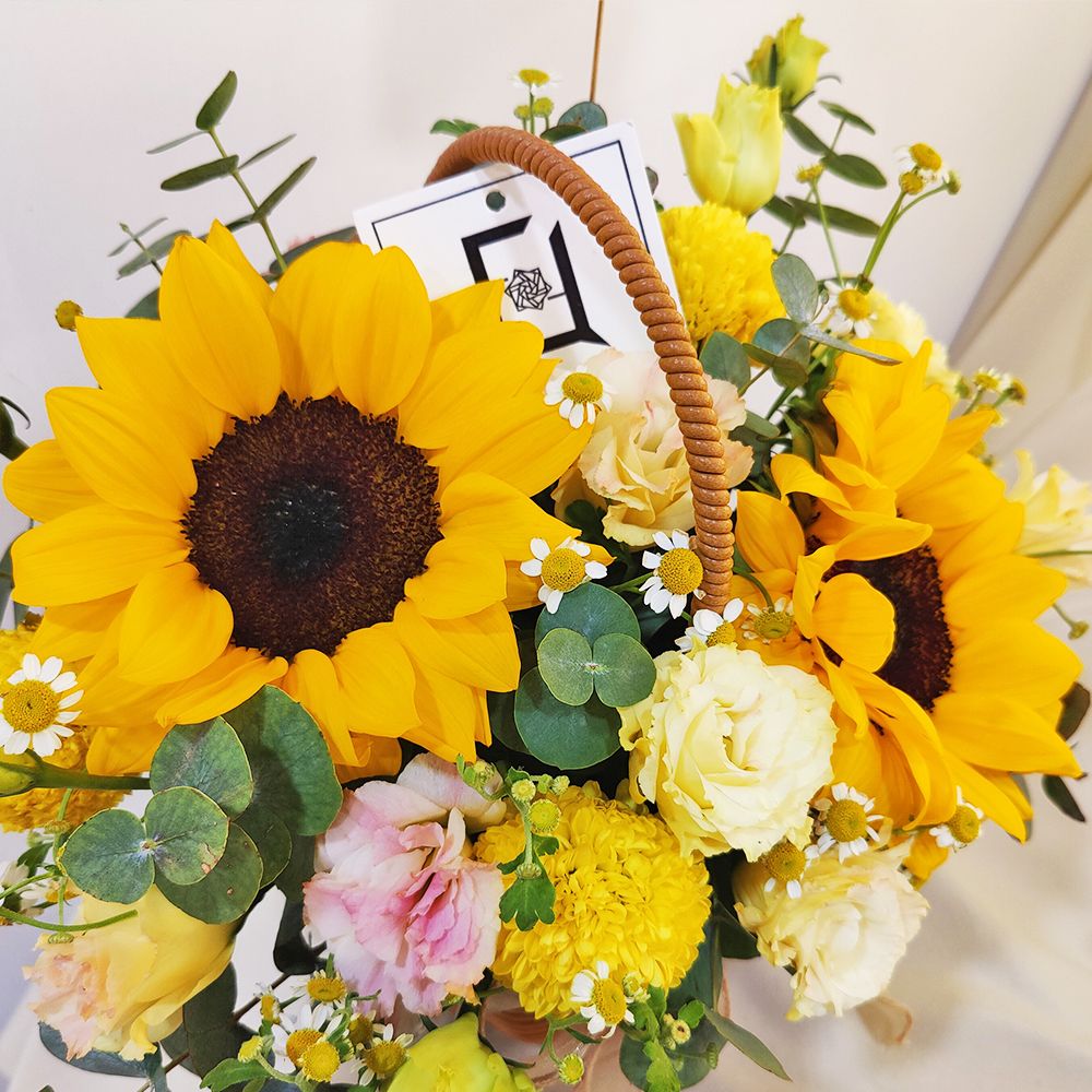Sometimes, all we need is a simple, pure smile. The “Radiant Morning” handle basket is the magic that makes that smile appear instantly. This is a piece where bright yellow is the main melody—vibrant sunflowers paired with “little sun” yellow ping pong mums amplify the imagery of “happiness” and “hope” infinitely. To keep this radiance from being too sharp, we’ve carefully added champagne eustoma to soften the visual edges, along with the rustic freshness of chamomile and the soothing scent of eucalyptus.