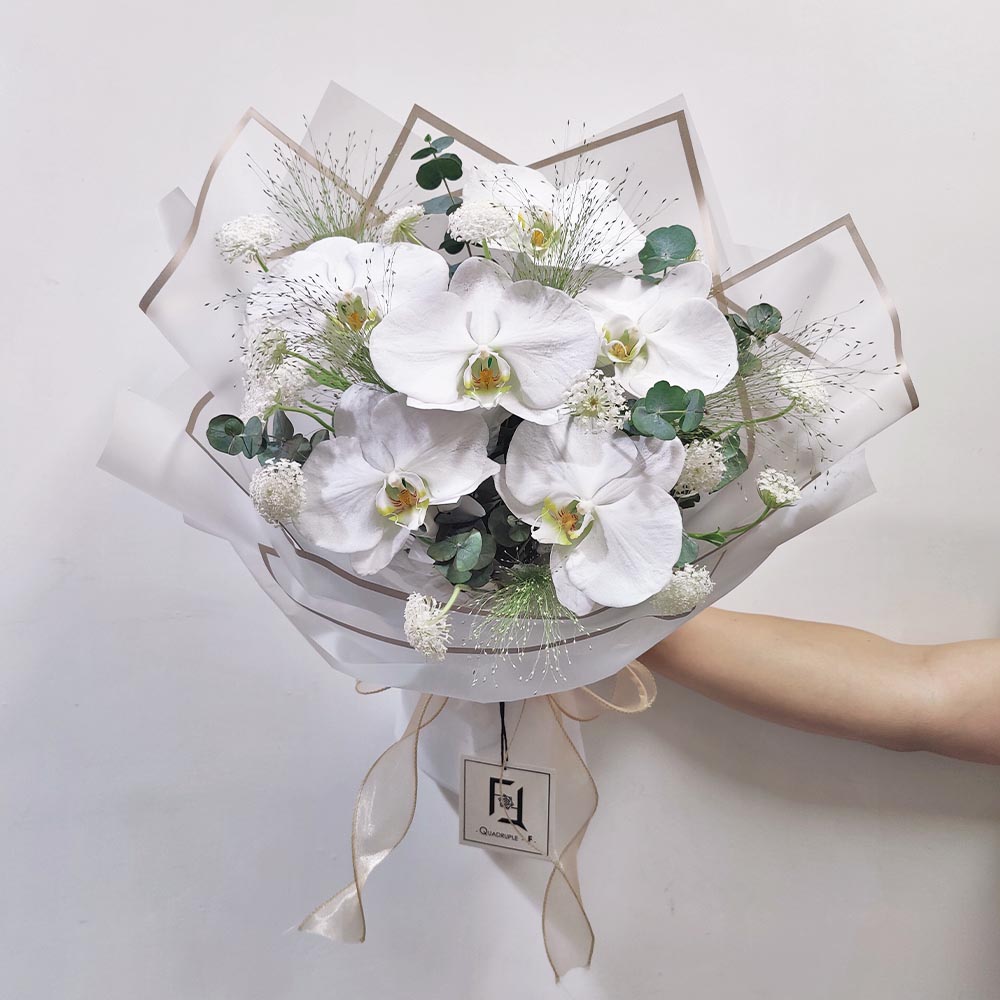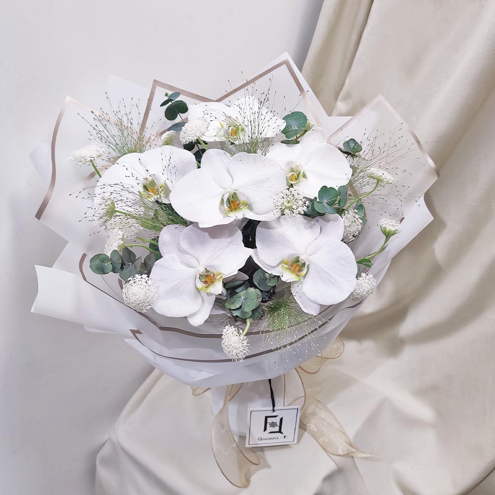 At Quadruple Flower, we believe floral art is more than just decoration; it is a story that touches the heart. Designing such a pure piece requires the ultimate in clean and transparent aesthetics. In our San Po Kong studio, our team ensures every orchid is flawless. This is the highest expression of taste and status, perfect for grand corporate openings or a gift for a sophisticated woman.
