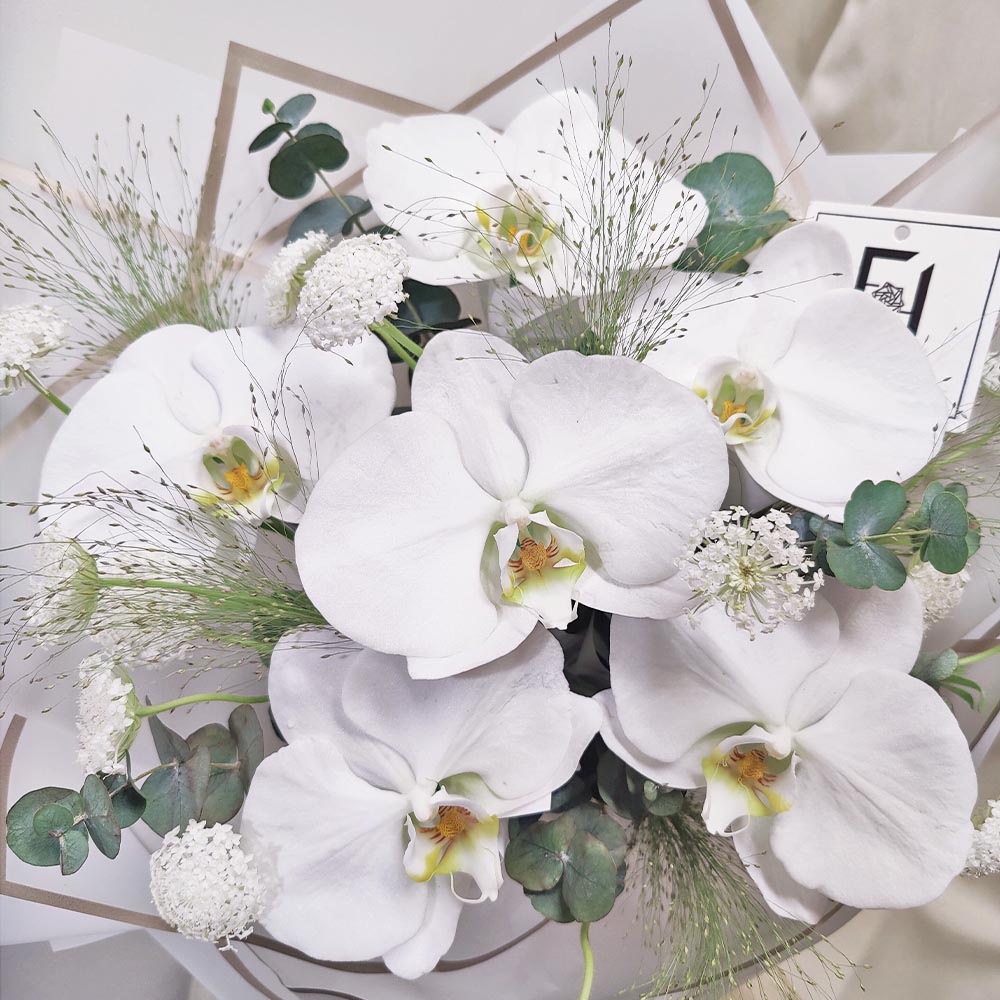 In a world of a thousand colors, pure white is often the most powerful and soul-shaking. The “Radiant Orchid Heart” is a song of praise for purity and elegance. We have used six top-tier White Phalaenopsis Orchids as the sole heart of the bouquet. Known as the “Queen of Orchids,” her posture resembles graceful butterflies perched on branches, emitting a cool, noble, and ethereal aura.