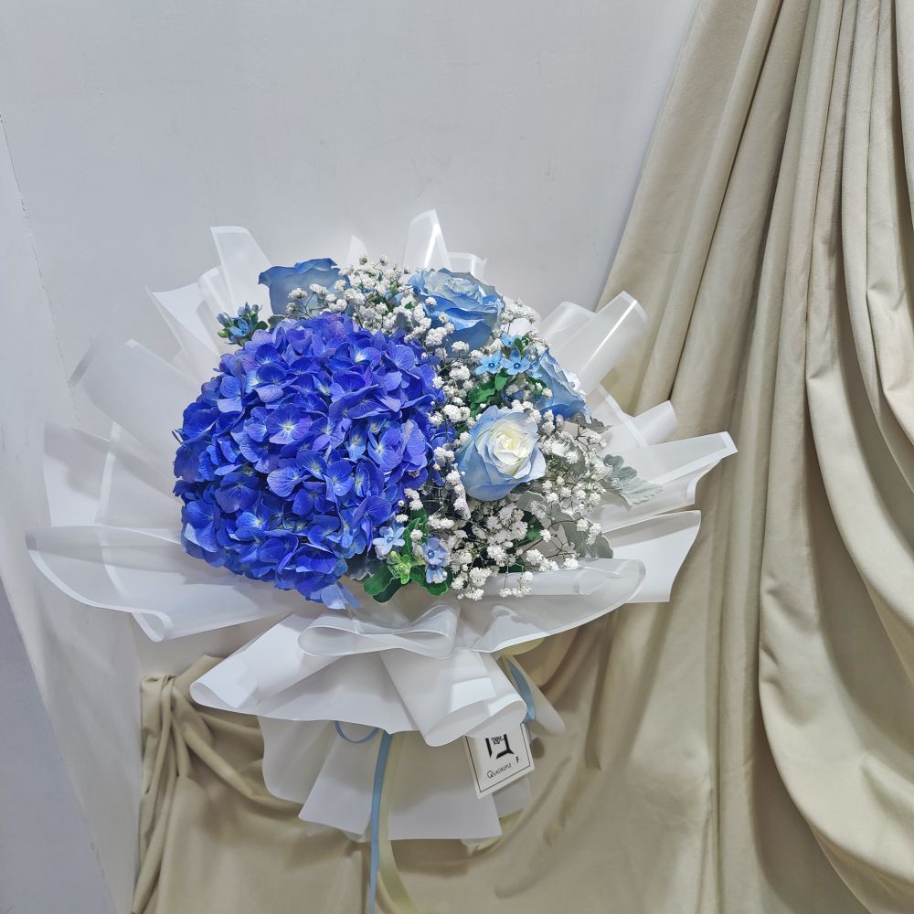“Snow Bleu Reverie” is a couture floral bouquet that embodies purity, elegance, and timeless romance. Featuring exquisite blue hydrangea, rare blue‑white roses, and delicate baby’s breath, each bloom is meticulously arranged and enveloped in an all‑white wrapping that evokes the serenity of snow and the allure of dreams.