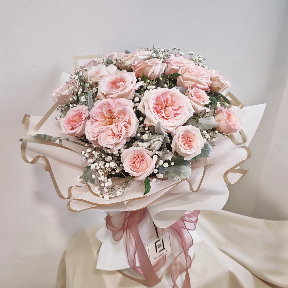 愛情中最動人的時刻,往往隱藏在那一抹溫柔的粉色之中。這束由19朵頂級粉嫩玫瑰組成的花束,其花語代表著「期待陪伴與一生守護」,是表達深情承諾的最佳載體。配上擁有雪白質感的銀絨葉與如繁星般閃耀的滿天星,營造出極致夢幻的甜蜜氛圍。
