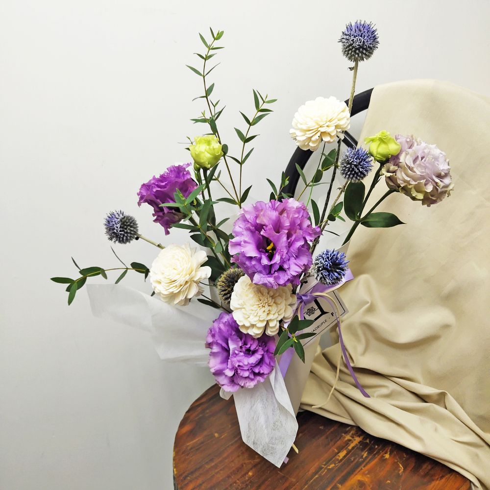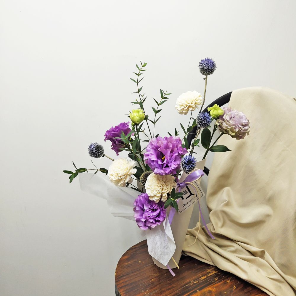 在 Quadruple Flower Hong Kong,我們相信花束是一份浪漫的故事。淺紫洋桔梗花桶枱花,以紫與白交織,延續愛與守護的傳說,成就香港最優雅的浪漫禮物。