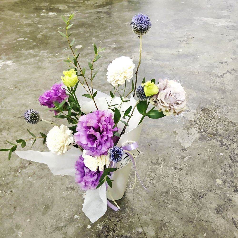 花材包括︰ .洋桔梗 .當季襯花葉材