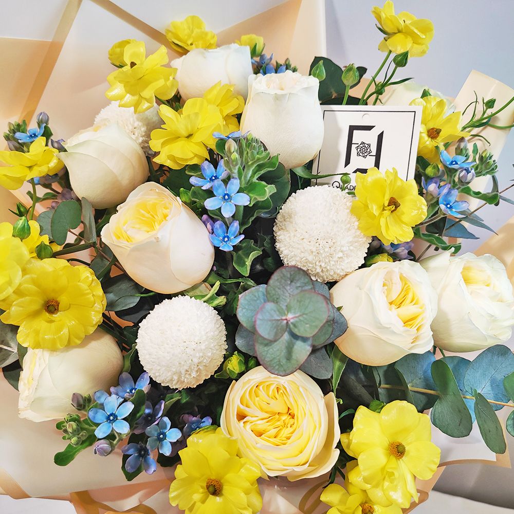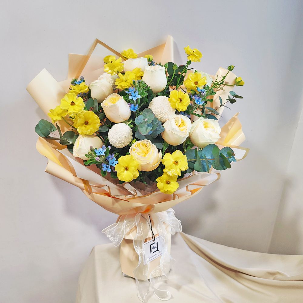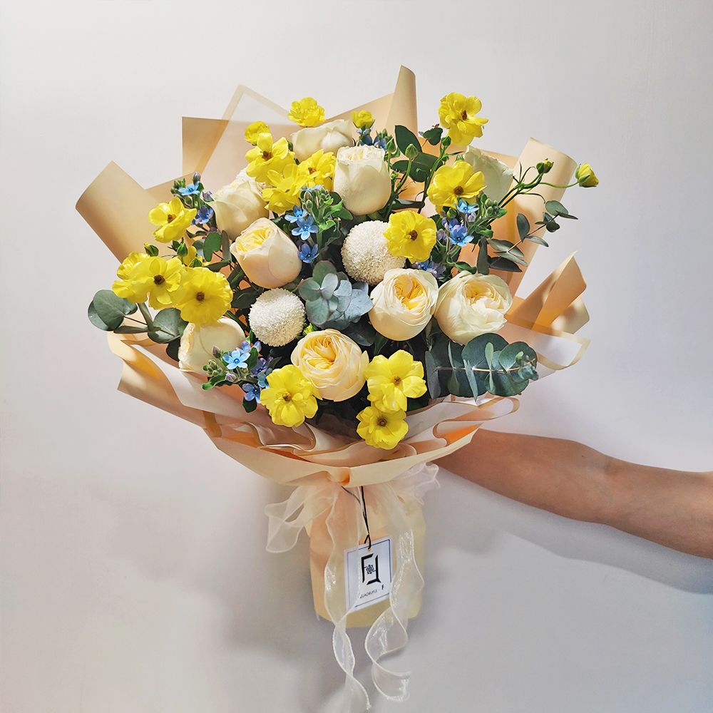 奶香四溢的奶油庭園玫瑰,色澤溫潤如玉,搭配跳躍的黃色蝴蝶洋牡丹與點點如繁星的藍星花。白色乒乓菊在其中營造出圓滿的視覺平衡,尤加利葉的清香緩緩散發。整束花散發著一種如初戀般清甜的氣息,不卑不亢,柔和地融入家居或辦公空間,為收花者帶來一整天的愉悅心情。