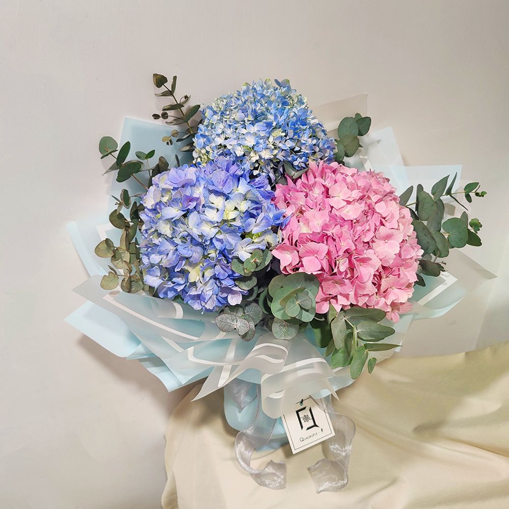 想要送上一份絕對震撼目光的重磅驚喜?這款集結了粉紅、淺藍與淺紫三色巨型繡球的花束,絕對是你的不二之選。繡球花的花語代表著「希望、忠貞與圓滿」,三種截然不同卻又極度和諧的色彩相互簇擁,在尤加利葉的襯托下,宛如宇宙中神祕且迷人的幻彩星雲。這款花束不僅體積龐大、氣場十足,更充滿了極致的浪漫氛圍,是求婚、結婚週年紀念或是盛大慶典上的完美焦點。