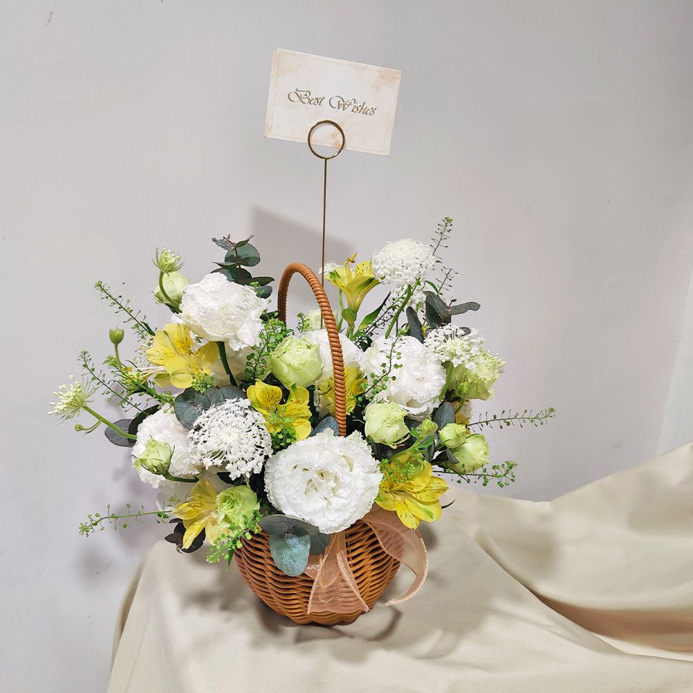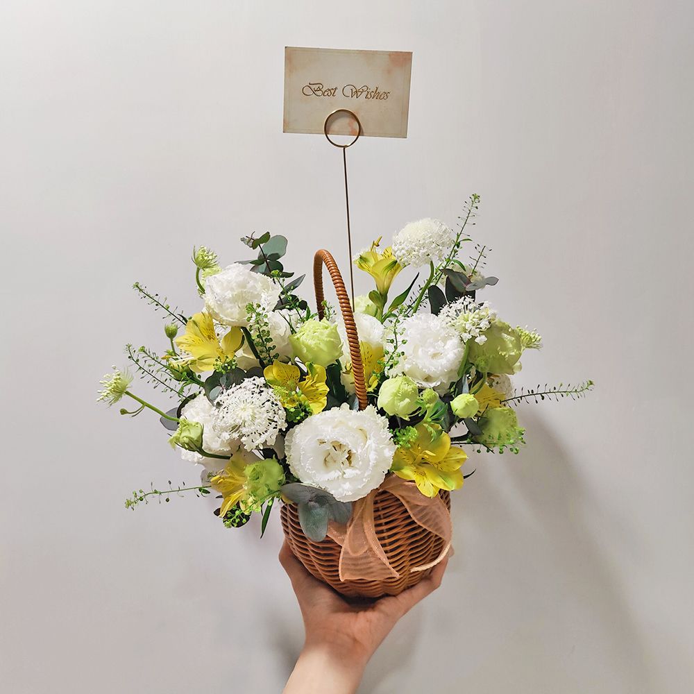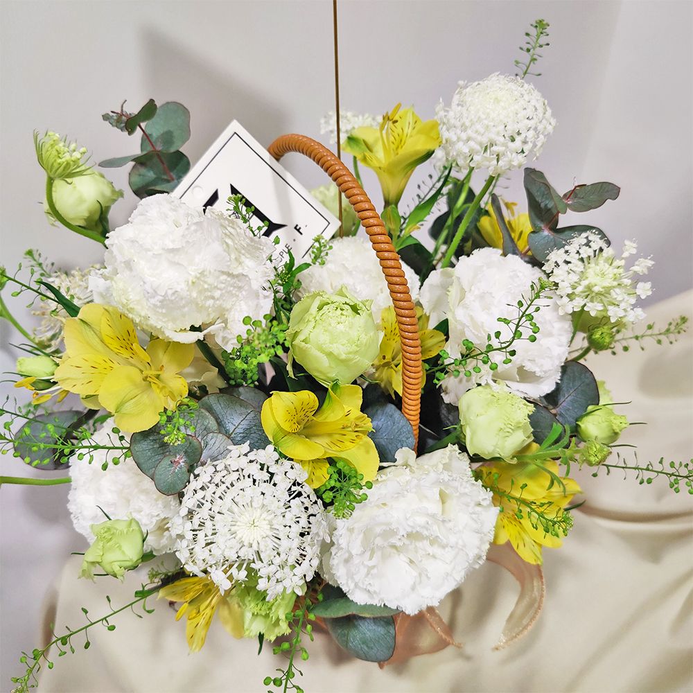 在繁忙的生活節奏中,我們都需要一方能讓心靈喘息的小天地。這款手提花籃以充滿自然氣息的仿藤編材質為載體,巧妙搭配了清新的黃色小百合與純潔的波浪白洋桔梗。白翠珠增添了如晨露般的細膩感,而自然垂墜的綠鈴草與尤加利葉,則讓整體充滿了森林系的生命力。這款設計體積精巧,非常適合擺放在辦公桌或家中茶几,為平淡的日子帶來如晨曦般的清新與活力。