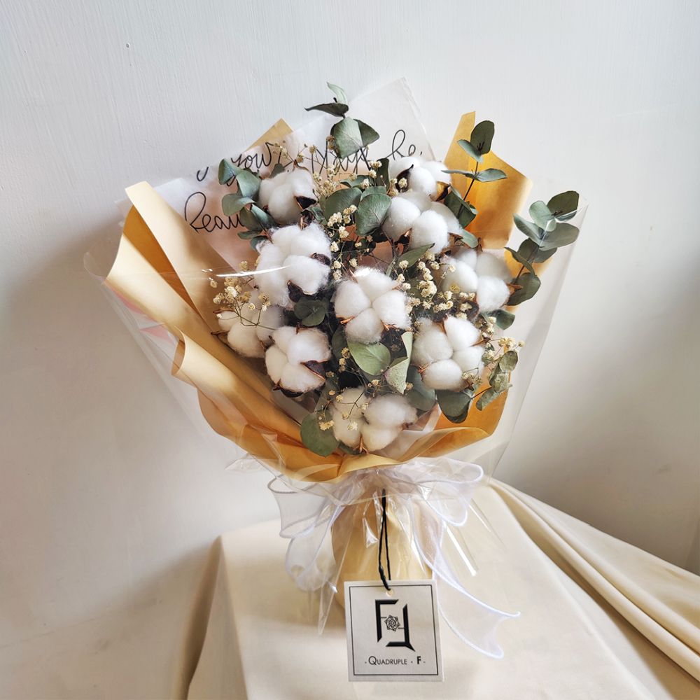 在每一個需要溫暖的日子裡,讓這份柔軟的心意代你說出關懷。這是經典棉花花束的升級之作,十朵優質棉花代表著對收花者「十全十美」的祝福。特別加入如繁星般的純白滿天星後,整體視覺更添夢幻與立體感;而綠意盎然的大尤加利葉,則為花束注入自然清新的氣息。這款作品不僅能為室內空間增添美感,更能傳遞一份持久的溫暖,非常適合在寒冬送禮,或是作為女朋友生日的溫馨驚喜。