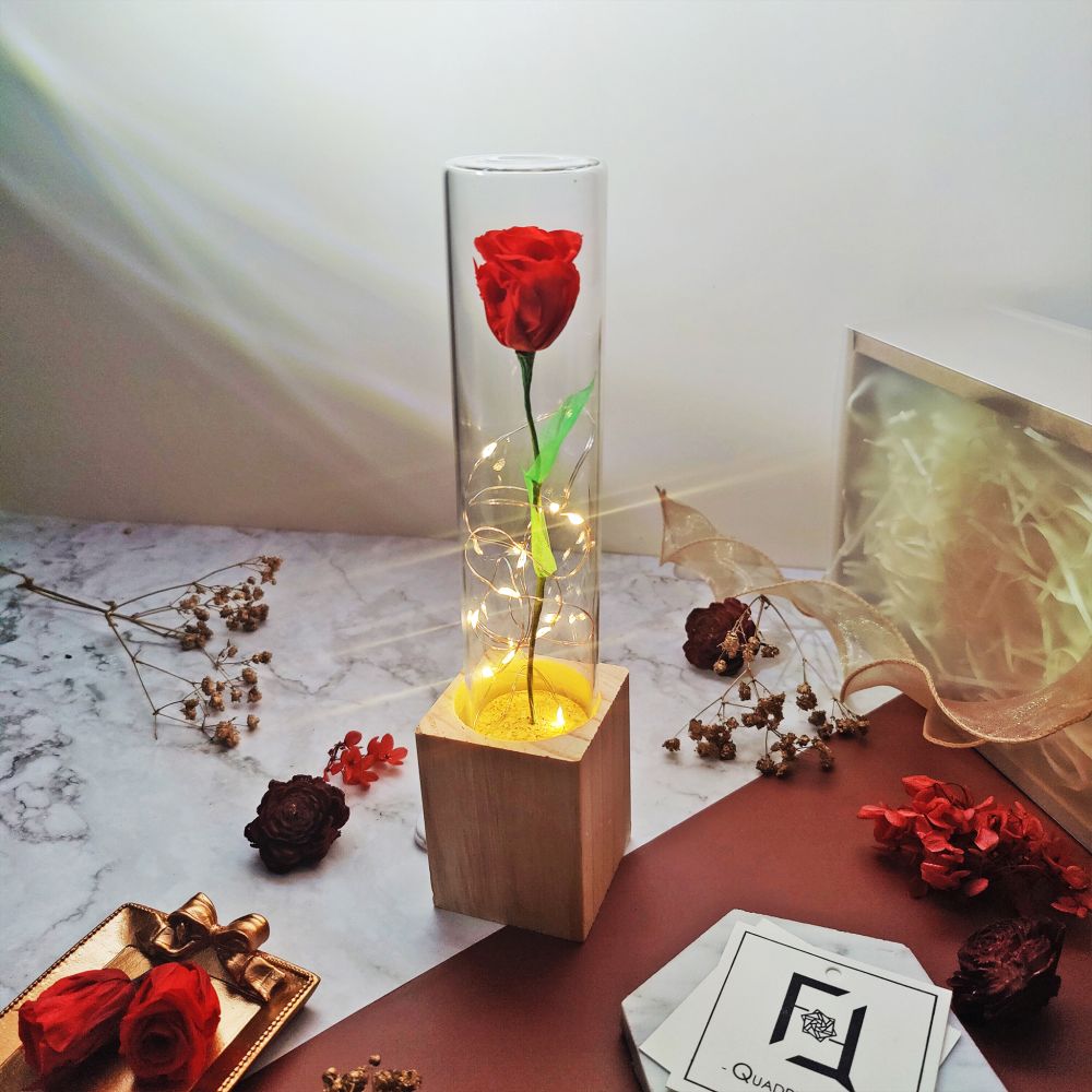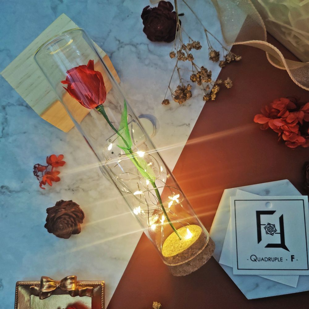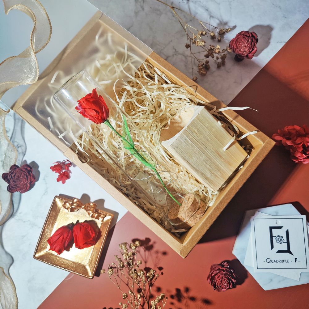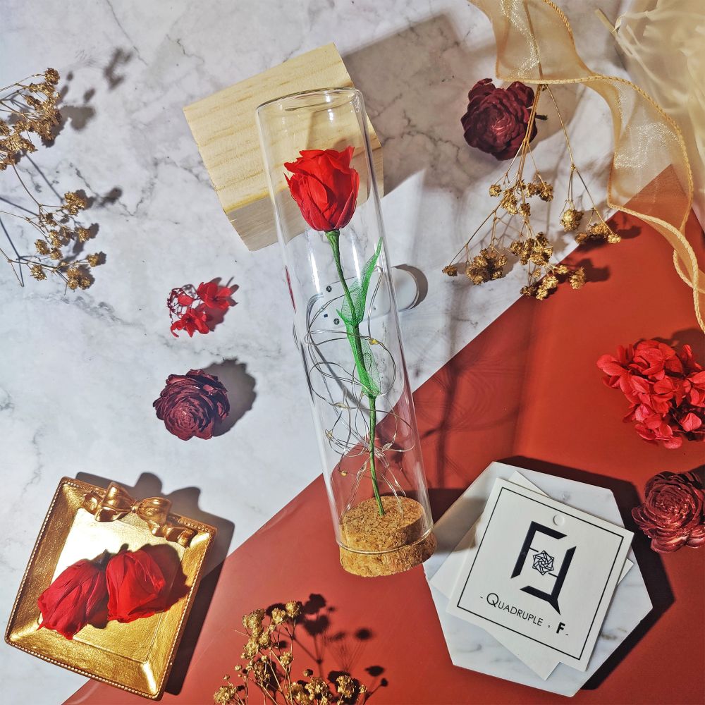「小王子在玫瑰花上花費的時光,讓這朵唯一的玫瑰變得如此重要。」愛情的故事,總是因獨一無二而動人。Quadruple Flower 推出的 永生花玫瑰玻璃試管,以小王子與玫瑰的經典寓言為創作靈感,將唯一的紅色永生玫瑰盛載於玻璃試管中,化為精品花禮,象徵珍惜與唯一。