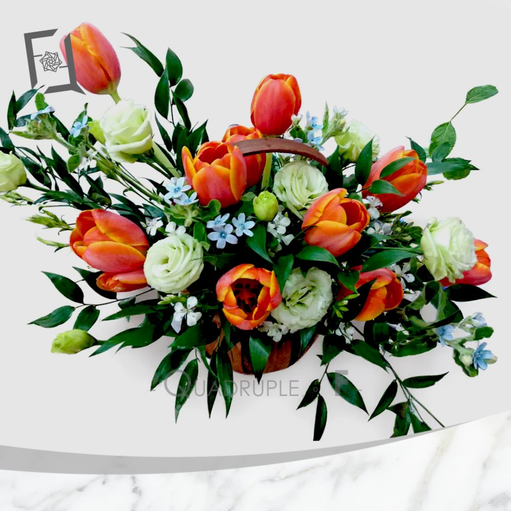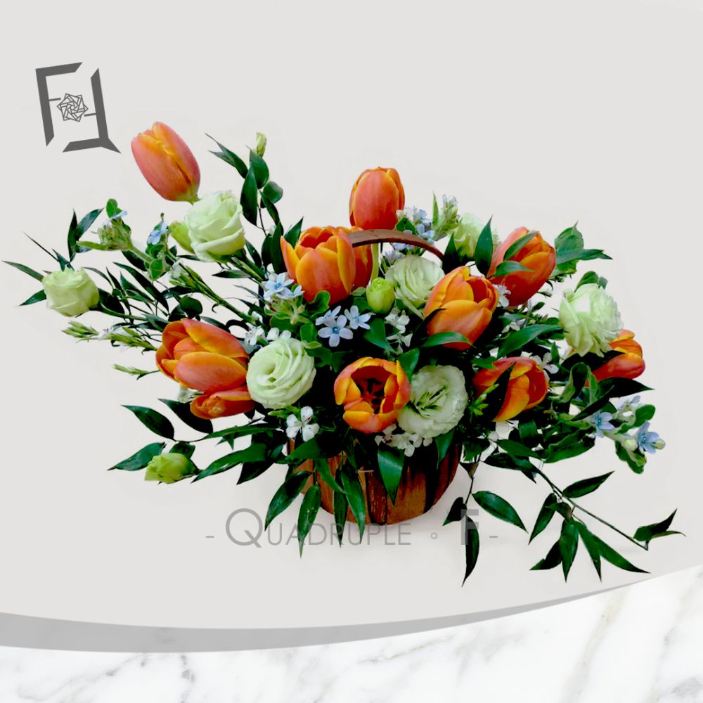 在喜悅的時刻裡,鮮花始終是最動人的語言。Quadruple Flower 推出的 橙色鬱金香祝賀小花籃,以鮮明的橙色鬱金香為主角,搭配綠色葉材,營造出活力與清新的氛圍。整體設計小巧精緻,配有手柄,方便手提或擺放。