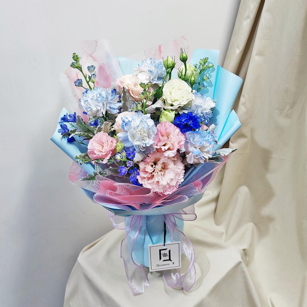 在 QuadrupleFlower,我們致力於將創意與美學融入每一件花禮中。在香港花店 QuadrupleFlower,我們相信花藝不只是單純的裝飾,而是一份能觸動心靈、彰顯收花者獨特品味的故事。這束「湛藍星波」是我們為追求獨特美學的您準備的專屬驚喜。QuadrupleFlower 的花藝師以精湛的搭配技巧,確保這份如夢似幻的藍粉漸層,能在母親節當天完美綻放。透過這份充滿藝術氣息的禮物,讓您的母親感受到您對她那份如星辰般珍貴的敬愛。