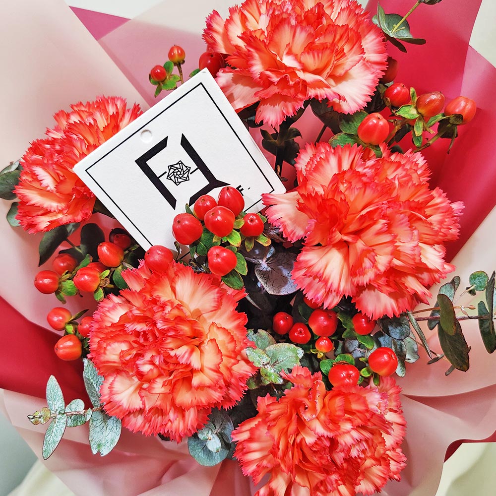 在如此強烈的色彩中,我們巧妙地引入了飽滿的紅荳。紅荳在華人傳統文化中不僅代表著深深的思念,更象徵著辛勤耕耘後的「豐收與喜悅」。它為花束增添了豐富的果實紋理與秋冬般的溫暖質感,彷彿在訴說著母親多年來對家庭的付出終於結出甜美的果實。尤加利葉的俐落線條與灰綠色調,則完美地平衡了紅橙色的熱烈,讓整件作品不僅充滿生命力,更具備了極高的現代時尚感。