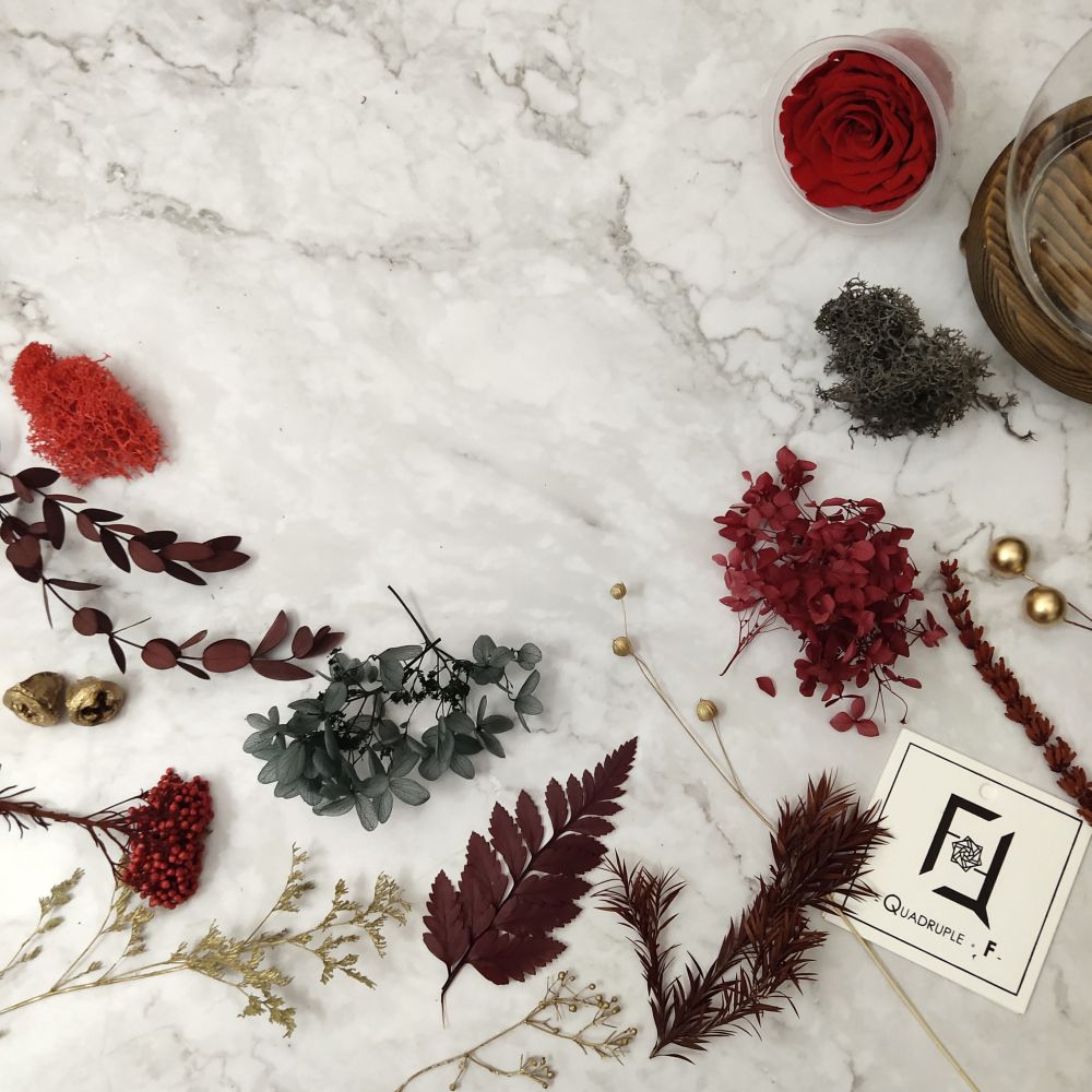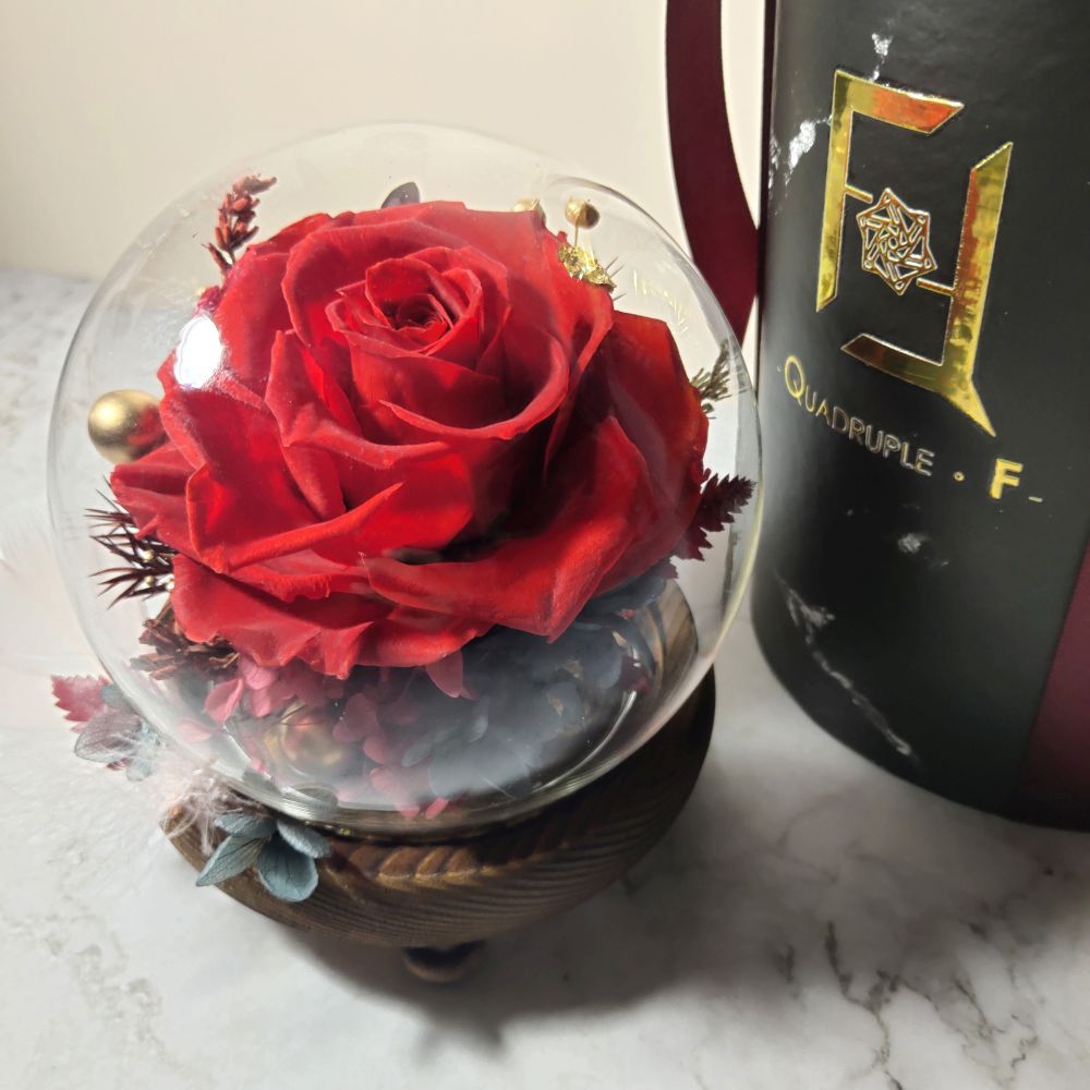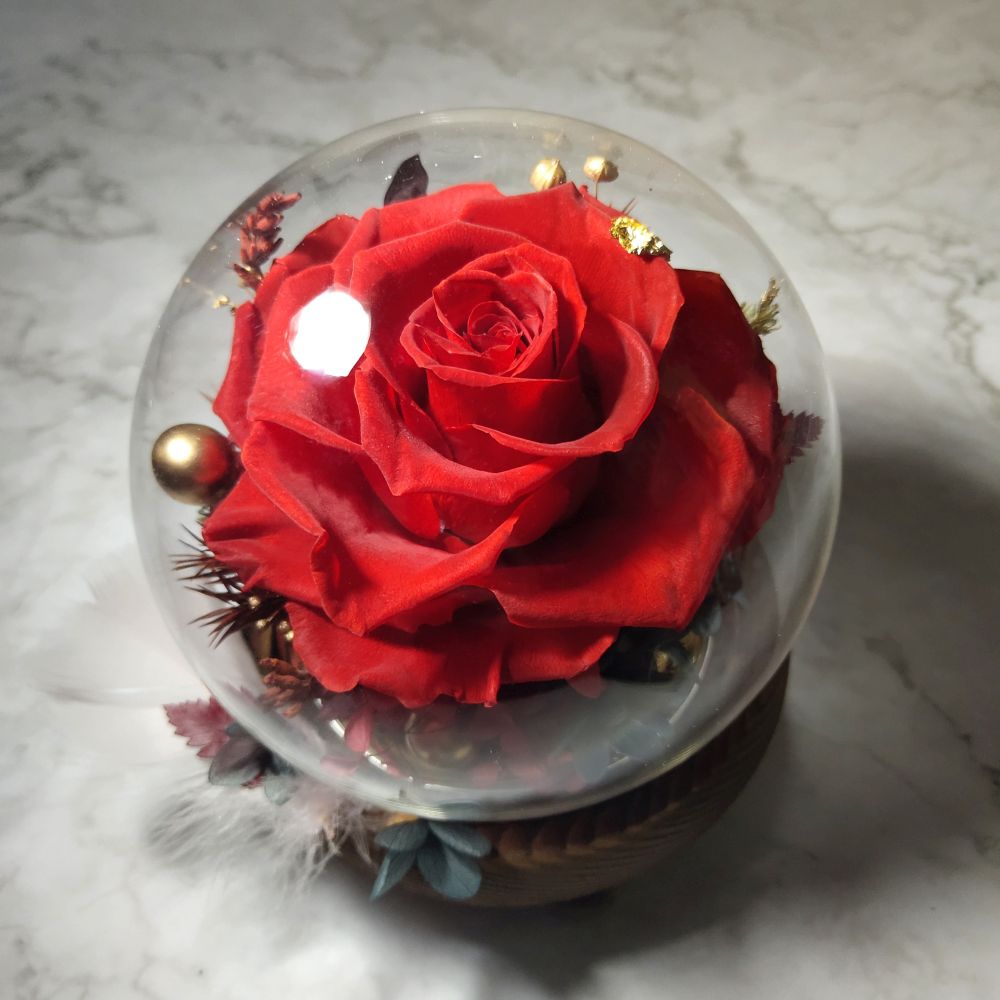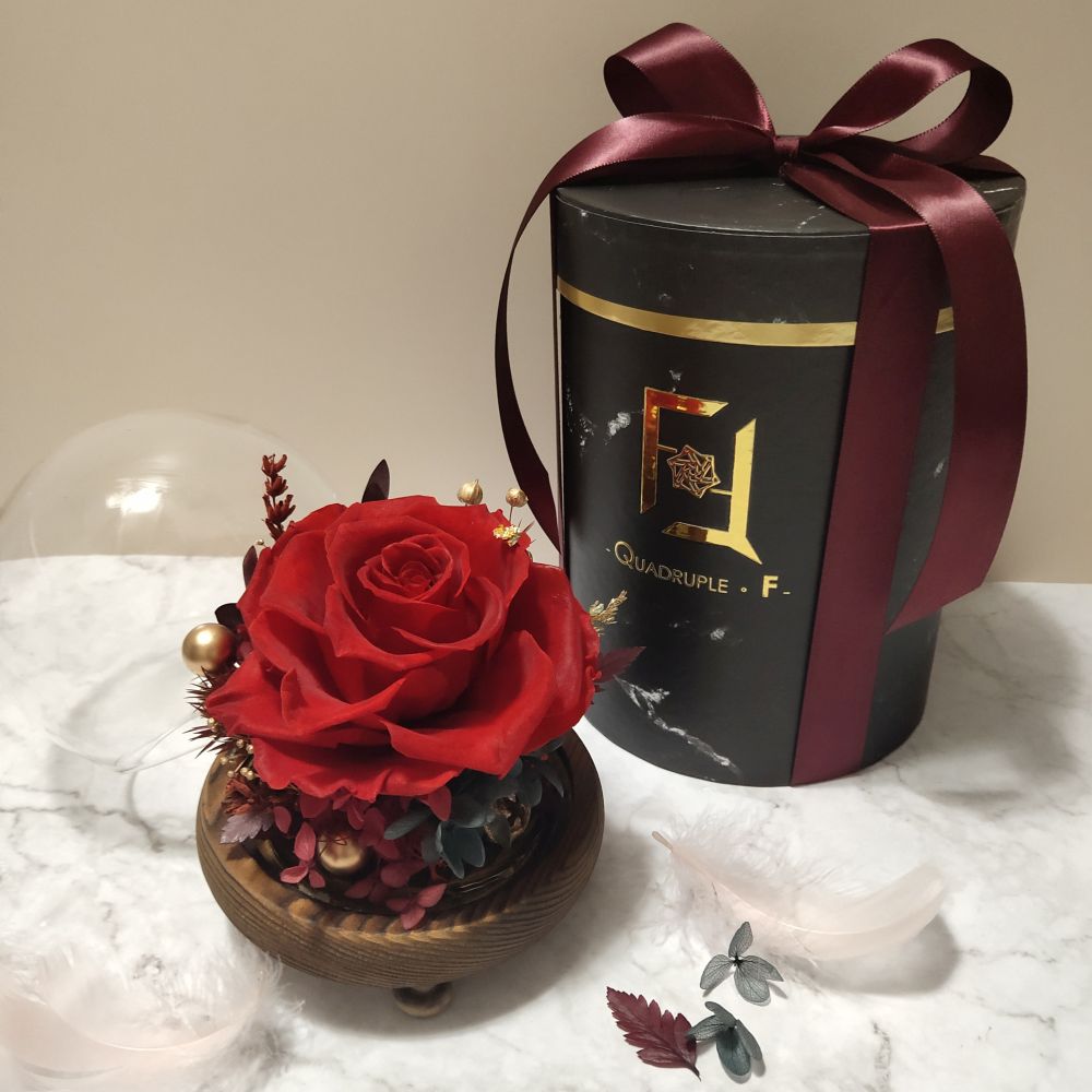 以基本為主題的永生花玫瑰玻璃罩, 選用最優質的永生花材, 以不同色系的玫瑰配搭相應色調的繡球以及十多種永生襯花葉材組合而成, 再以金色提亮, 色調配搭盡顯經典氣息。