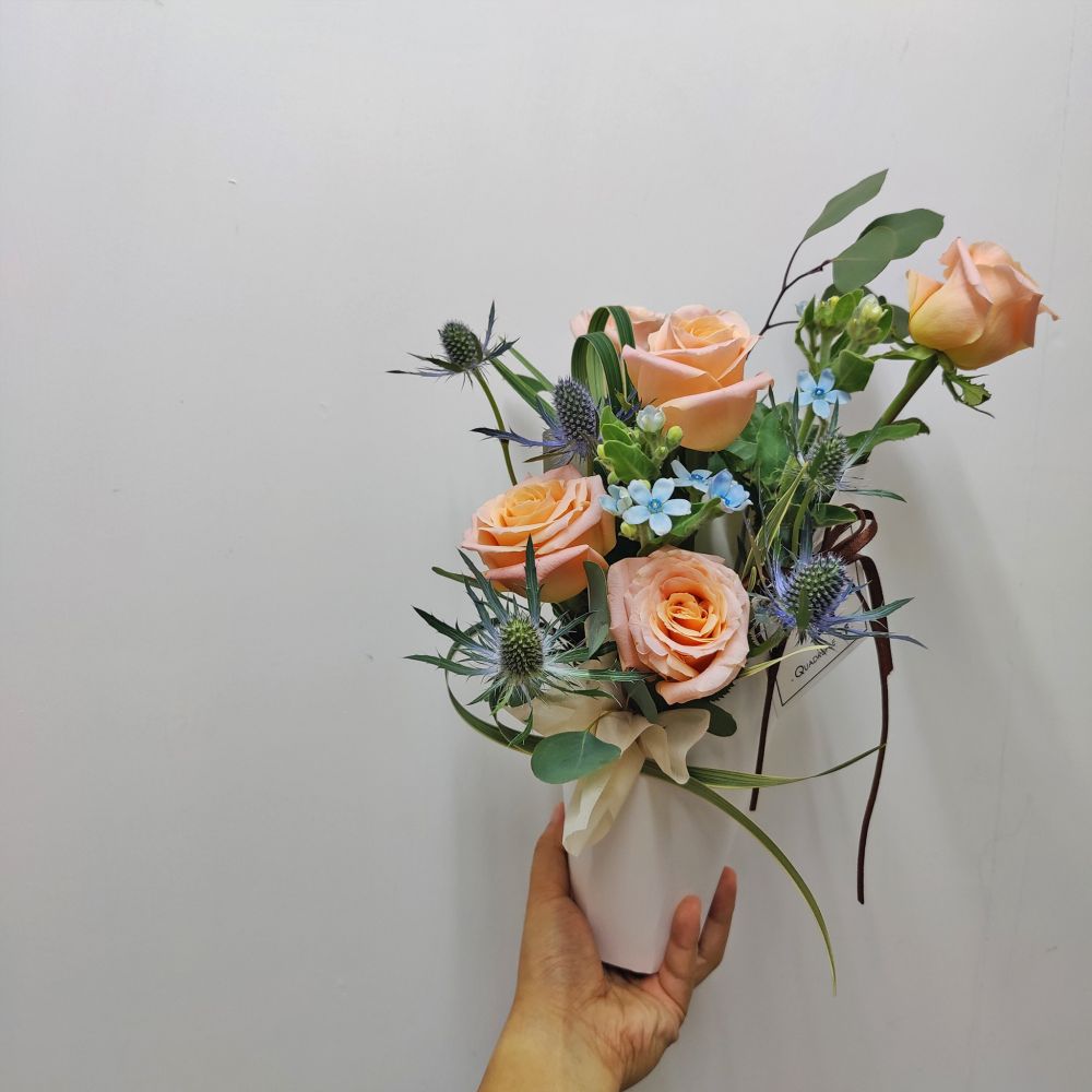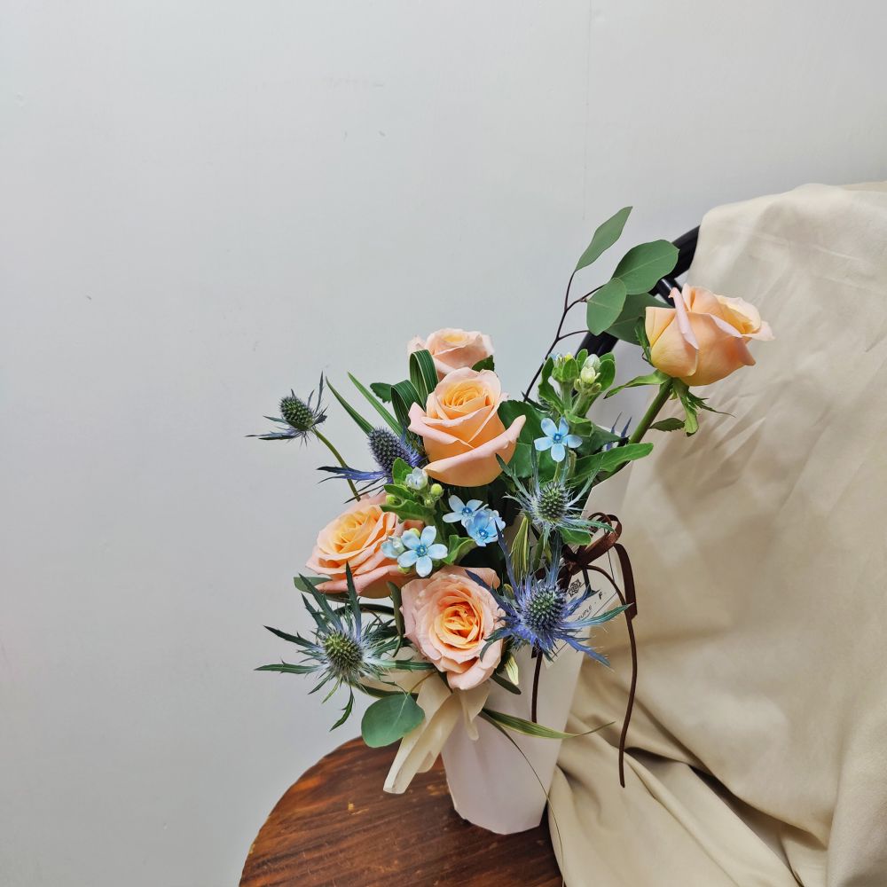 香檳玫瑰的花語是「優雅與浪漫」。這款 香檳玫瑰花桶枱花,以柔美的香檳玫瑰搭配淺藍襯花,營造出清新驚艷的氛圍。純白花桶與韓式插法設計,讓花朵之間呈現多層次空間感,既大膽又富故事性。