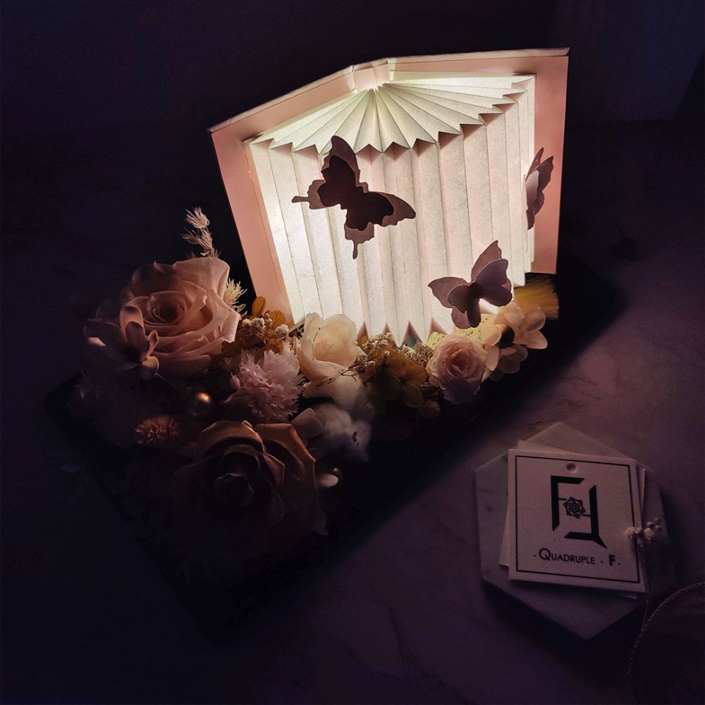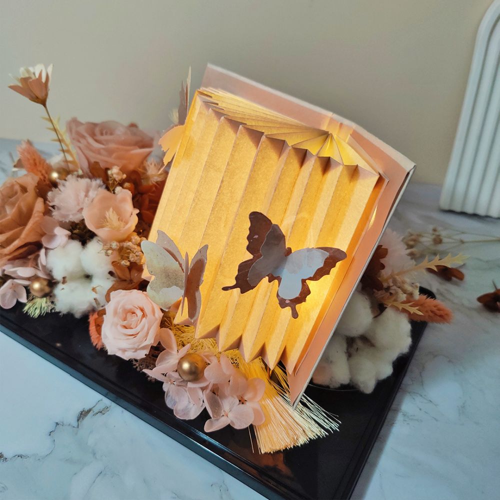 在微光中,一本復古淺粉紅色的書本燈籠緩緩亮起,彷彿翻開了一段浪漫的篇章。書頁之間,靜靜綻放著 永生粉紅玫瑰 與柔軟的棉花,色調以懷舊淺啡與復古淺粉紅交織,營造出溫暖而優雅的氛圍。