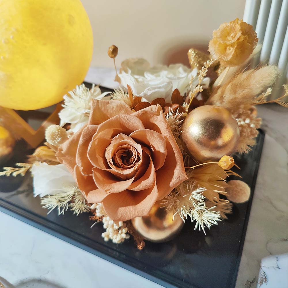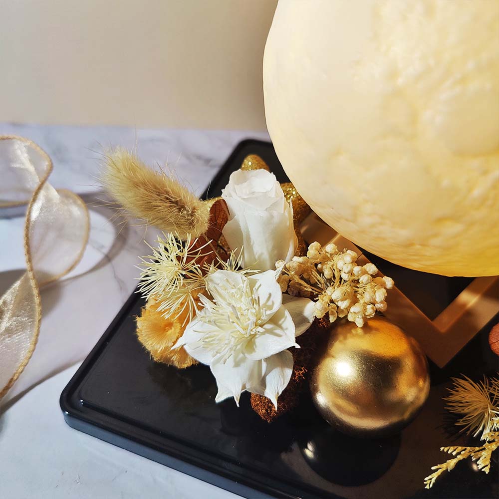 夜幕低垂,當城市的喧囂漸漸平息,一盞散發著柔和光芒的月亮燈,將為你點亮專屬的浪漫角落。這款「永生花玫瑰發光月亮燈花盒」,巧妙地將實用的居家夜燈與永恆的保鮮花藝完美結合。設計師精心挑選了兩朵飽滿的大玫瑰與三朵精緻的小玫瑰作為視覺核心,搭配豐盈的繡球花與手工細作的通草花,營造出如夢似幻的立體層次。大銀波與金星的點綴,彷彿將浩瀚星空與皎潔月色濃縮於這方寸之間,再加上其餘十一種豐富花材的細膩鋪陳,展現出極致奢華的藝術美感。