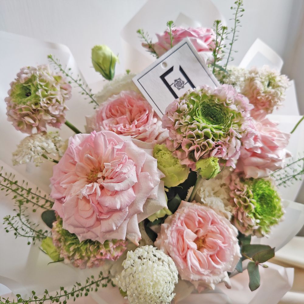 總有一種溫柔,能瞬間撫平生活中的所有疲憊。這款花束完美結合了粉玫瑰的經典浪漫與粉色錦鯉洋牡丹的精緻層次感。花藝師特意加入了純白的洋桔梗、翠珠與BB草,配合尤加利葉營造出充滿空氣感與流動的線條美。