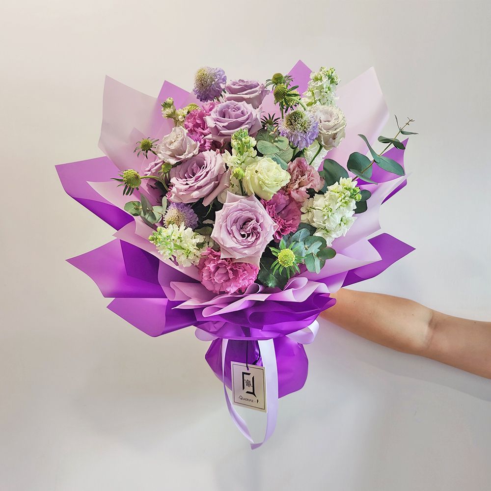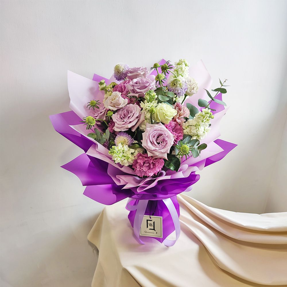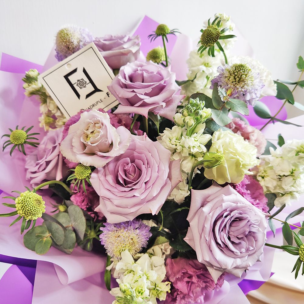 在香港花店 QuadrupleFlower,我們相信每一束花藝創作都是一場與心靈的對話。這束「紫夜凝香」代表了我們對神祕美學的獨特解讀。我們嚴選每一枝紫羅蘭與玫瑰,確保花束綻放的不只是色彩,更有沁人心脾的芬芳。這不僅是一份精緻的禮物,更是 QuadrupleFlower 幫您將這份如夜空般深邃的關懷與思念,細緻地送到對方手中,照亮彼此的心靈空間。