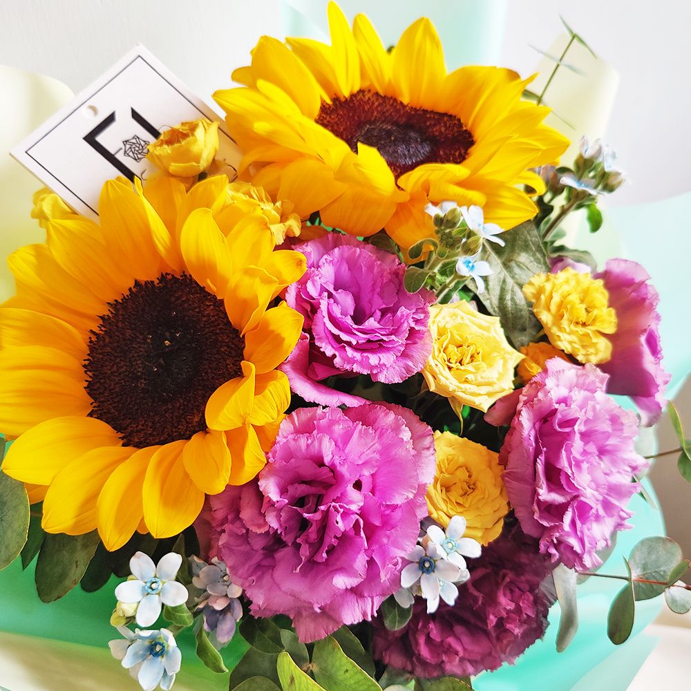 這是一款色彩層次感分明、充滿時尚活力的作品。向日葵象徵著永恆的陽光,而環繞周圍的波浪紫洋桔梗則賦予了花束一種神祕而高雅的魅力。黃小玫瑰與藍星花的色彩跳躍,打破了深色調的沉悶,呈現出一種富有節奏律動感的美感。大尤加利葉的延伸感讓整束花看起來舒展而大氣。