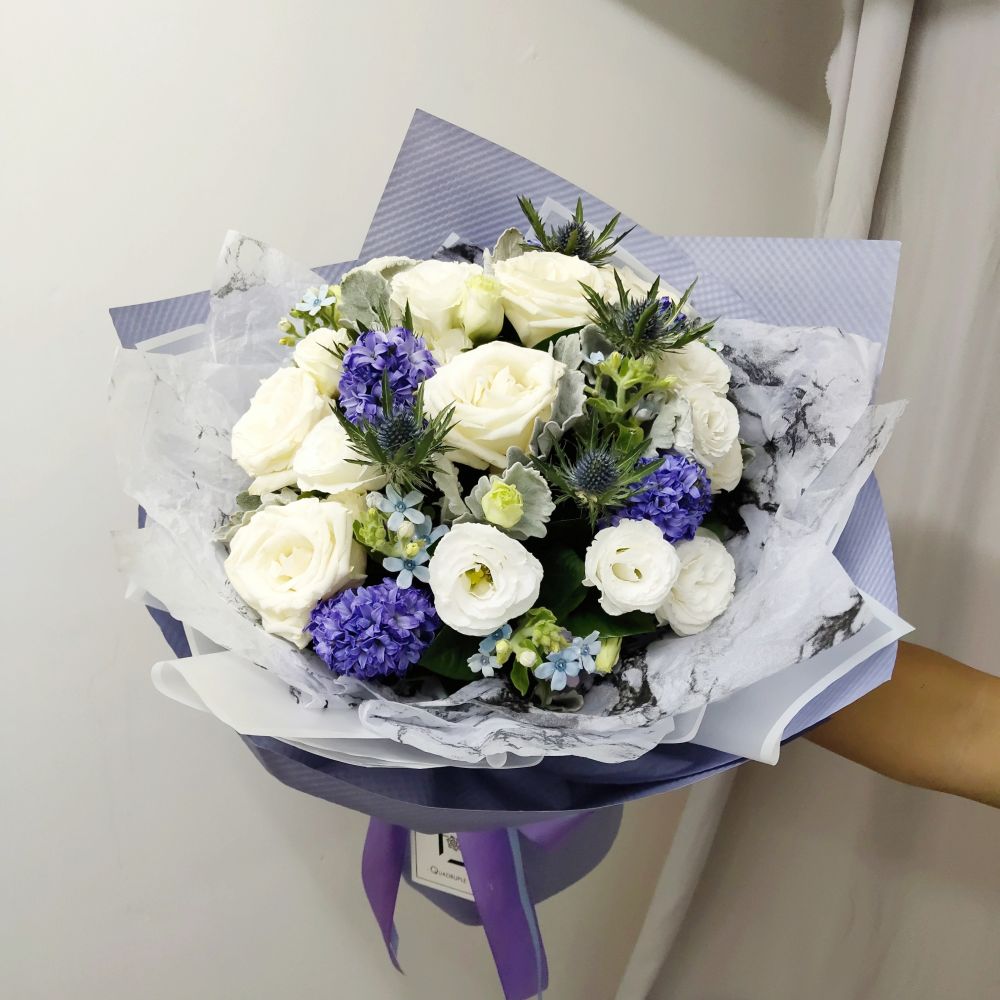在 Quadruple Flower Hong Kong,我們相信花束是一份浪漫的故事。白玫瑰紫藍風信子花束(圓形包裝),以白與紫藍交織,延續愛與希望的傳說,成就香港最獨特的浪漫禮物。