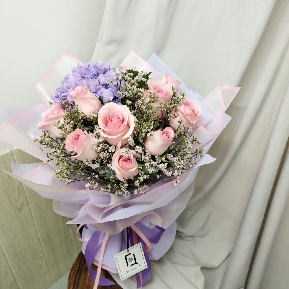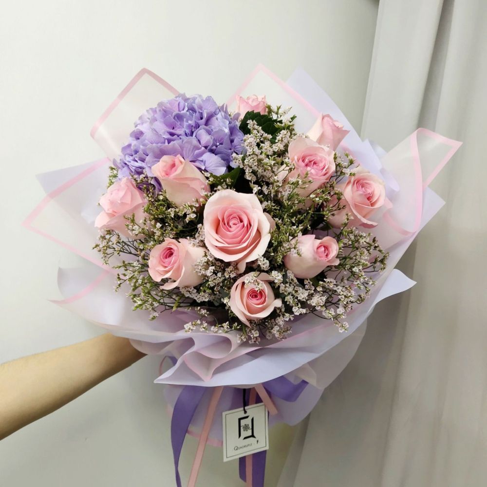 在 Quadruple Flower Hong Kong,我們相信花束是一份浪漫的故事。粉玫瑰淺紫繡球花束,以粉與紫交織,延續愛與希望的傳說,成就香港最夢幻的浪漫禮物。