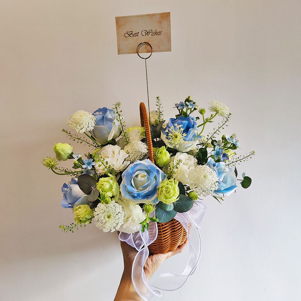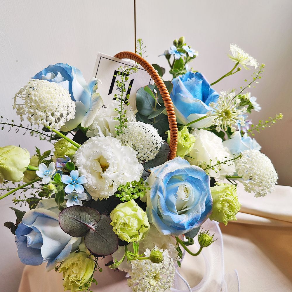想要在煩囂的城市中尋找一片寧靜?這款以藍白色系為主調的鮮花籃,將為你帶來極致的視覺降溫。我們選用了經過特殊工藝染色的「碎冰藍」白玫瑰,搭配如星光般閃爍的稀有藍星花,層次分明且夢幻。波浪白洋桔梗與綠鈴草的加入,中和了藍色的冷峻,帶來了如海風般的清新空氣感。這款冷色調的花籃不僅充滿靜謐感,更打破了鮮花專屬女性的刻板印象,非常適合贈送給男士或喜愛藍色的朋友。