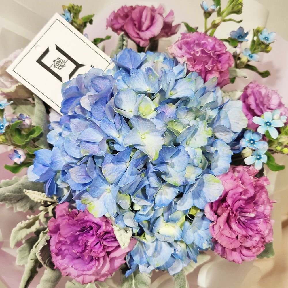 想要在煩囂的城市中尋找一片寧靜的海?這款以藍紫色系為主調的花束,將為你帶來極致的視覺降溫。一顆飽滿的藍色繡球花如同深邃的海洋,搭配如星光般閃爍的稀有藍星花,層次分明。波浪紫洋桔梗增添了水波蕩漾的流動感,而銀絨葉則完美模擬了海浪拍打礁石激起的雪白浪花。這款花束不僅視覺消暑、帶給人無比的平靜感,其冷色調的設計也非常適合贈送給男士。