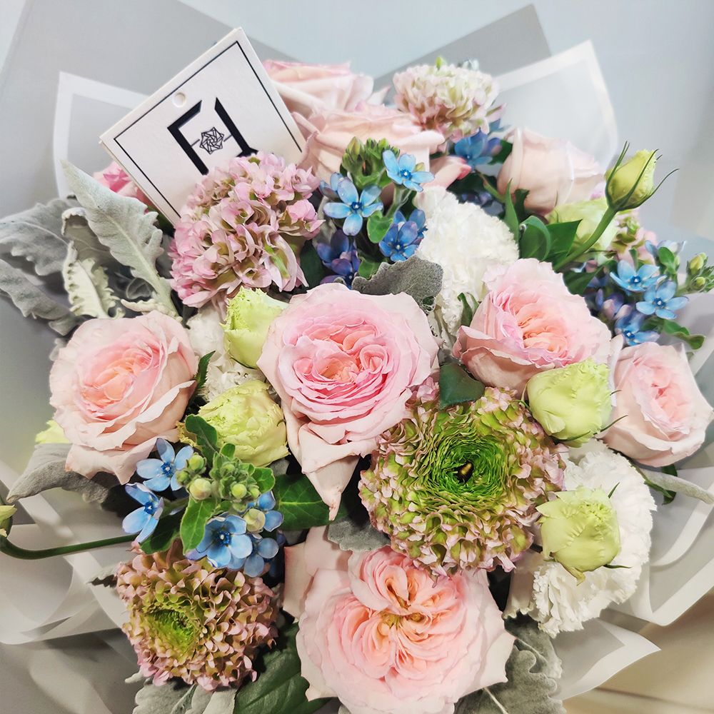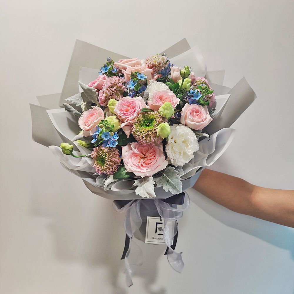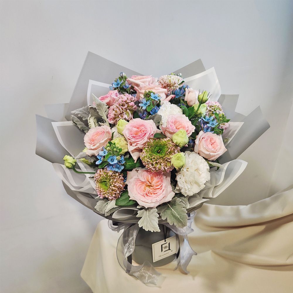 盛開的粉紅玫瑰代表著初戀般的悸動,配上色彩獨特、形如錦鯉躍動的粉色洋牡丹,充滿了東方美學與浪漫情懷的碰撞。藍星花如碎鑽般點綴其間,波浪白洋桔梗與銀絨葉的搭配,更為花束披上了一層雪白朦朧的面紗。整體設計層次分明,色彩柔而不嬌,展現出一種清新脫俗的高級感。