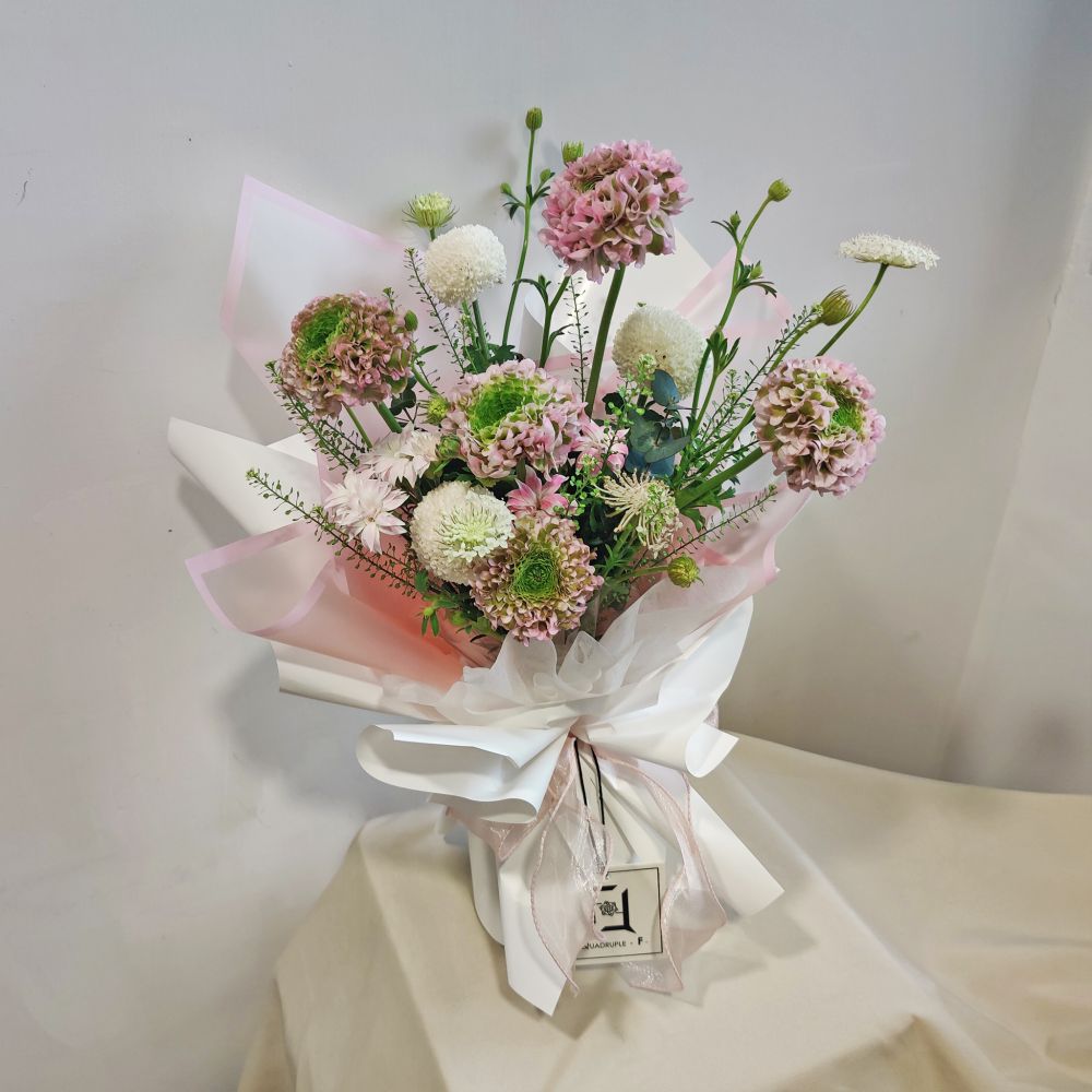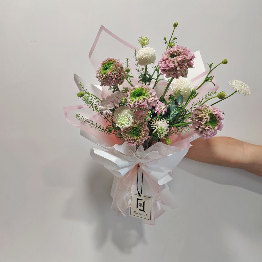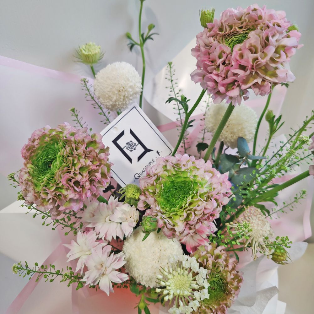 在每一個值得慶賀的閃耀時刻,都需要一抹斑斕的色彩來點綴。我們特別選用色彩漸變迷人、充滿藝術氣息的錦鯉洋牡丹為主花,宛如池中靈動的錦鯉,帶來好運與生機。配搭象徵「圓滿無缺」的白色乒乓菊,以及輕盈的白翠珠、BB草和粉紅小丁,交織出極具層次與跳躍感的視覺饗宴。這款花束完美演繹了法式花藝的慵懶與優雅,最適合送給獨具生活品味的女性,或作為升職祝賀之選。